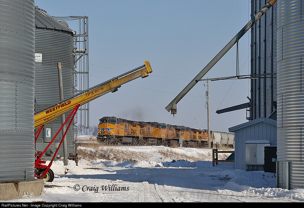In true large barge fashion, this Elkhart, IN, (off the NS) to North Platte, NE, freight rumbles west with around 10,000 feet of manifest junk for NP. The train seen here passing thru CP 100 at Watkins in central Iowa. There is a small little co-op here that help the photography cause. The 9820 trailing unit has alot of snow on it, maybe fresh out of a deadline?