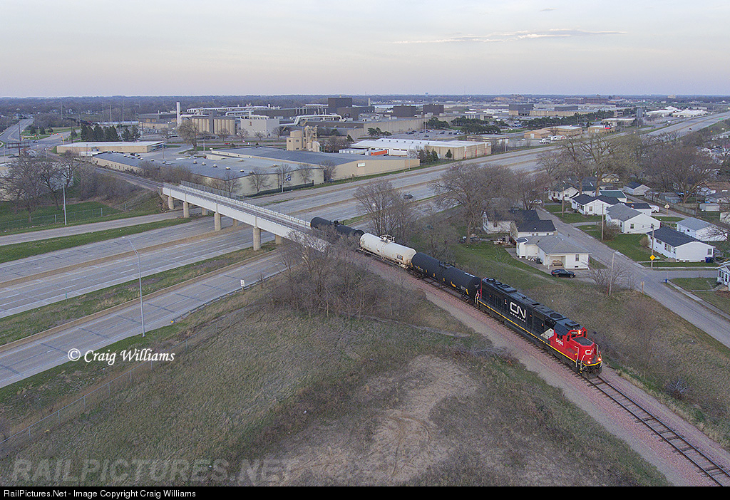 Back many years ago the ex-Rock Island Mainline (then Iowa Northern Main) passed under this bridge and there was no interstate. The state spent tons of money to build this bridge for the CN to service the lone customer on this part of the industrial trackage 3 days a week. The grade to get up to this bridge is something special! Alot of the big building in the background is the John Deere Foundry. |