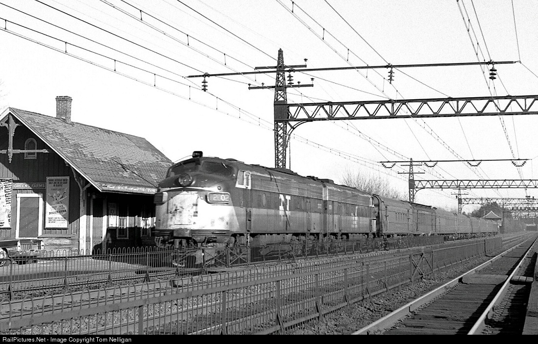 The New Haven Railroad had less than 48 hours left in its corporate life this day as a pair of FL9s sped past the 19th century station at Greens Farms, CT, with a Grand Central-bound express. Lead unit 2002. like many FL9s, had largely lost its nose logo to erosion.