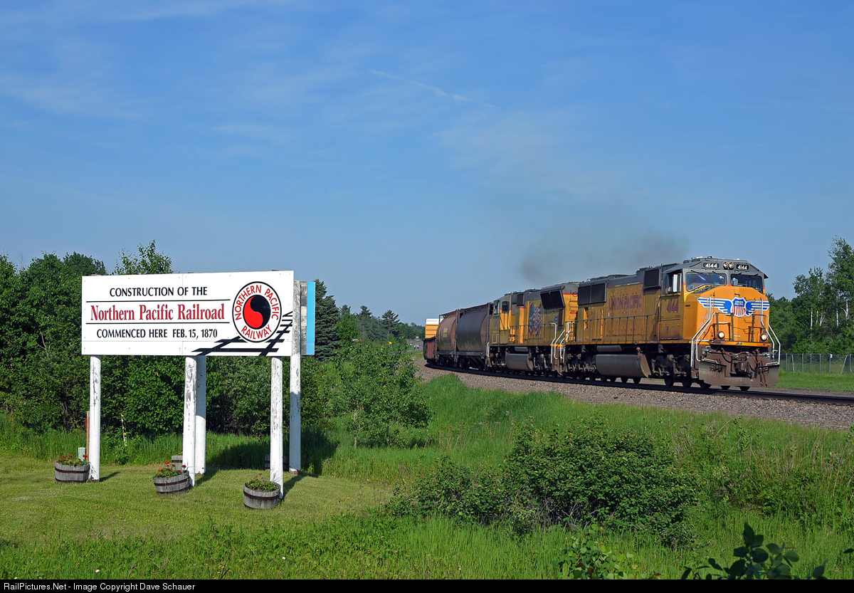 | Due to a large washout on BNSF's Hinckley Sub near Holyoke, UP detoured at least two Superior to Des Moines trains over the Brainerd Sub. Here a BNSF Dilworth crew hustles M-ITDM west past the Northern Pacific first spike sign at Carlton. Foreign road detours over the Brainerd Sub are rare. |
