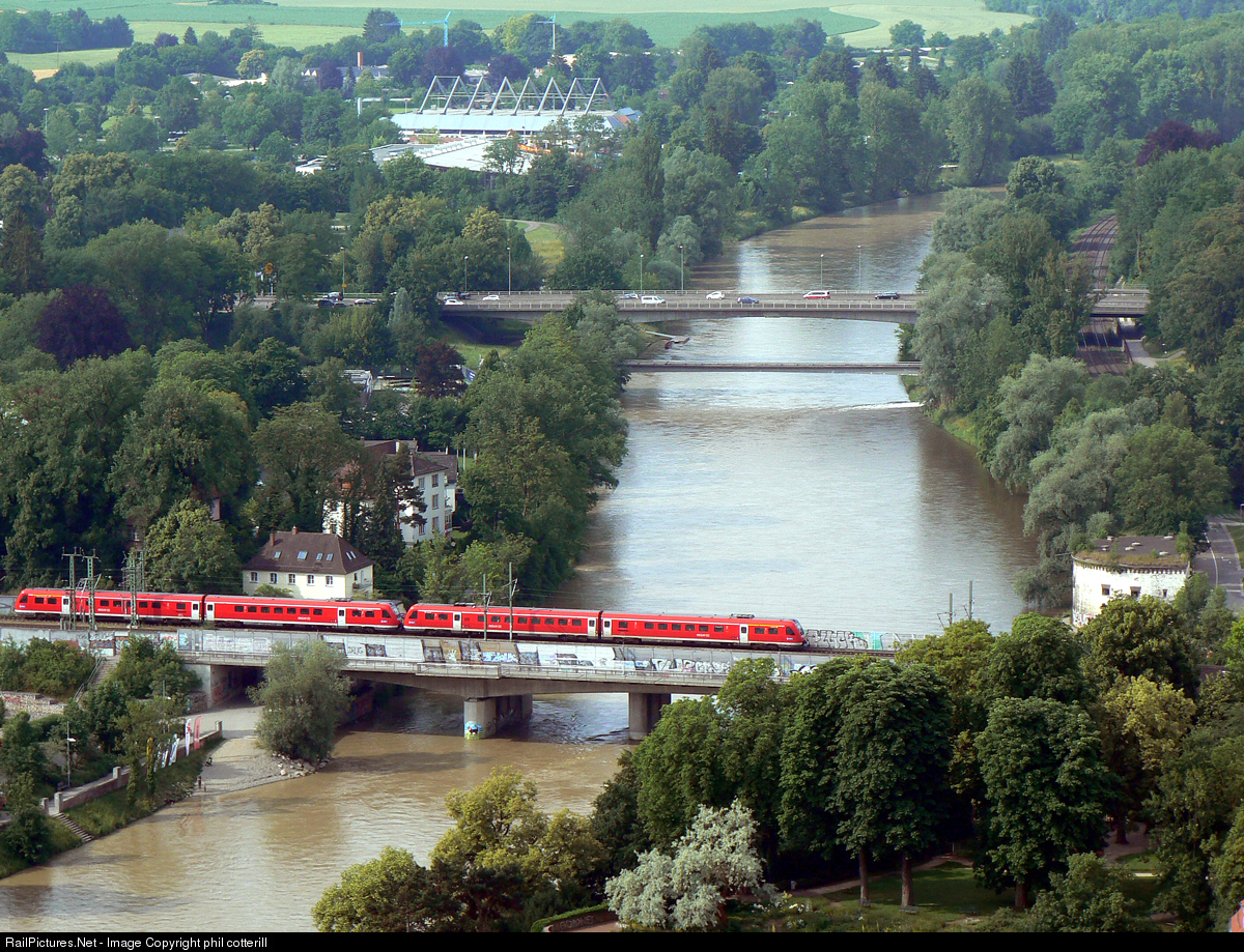 | A 4 car DMU crosses the River Danube as it arrives at the south end of Ulm. Photo taken from Ulm Minster, which involved climbing 768 stairs! |