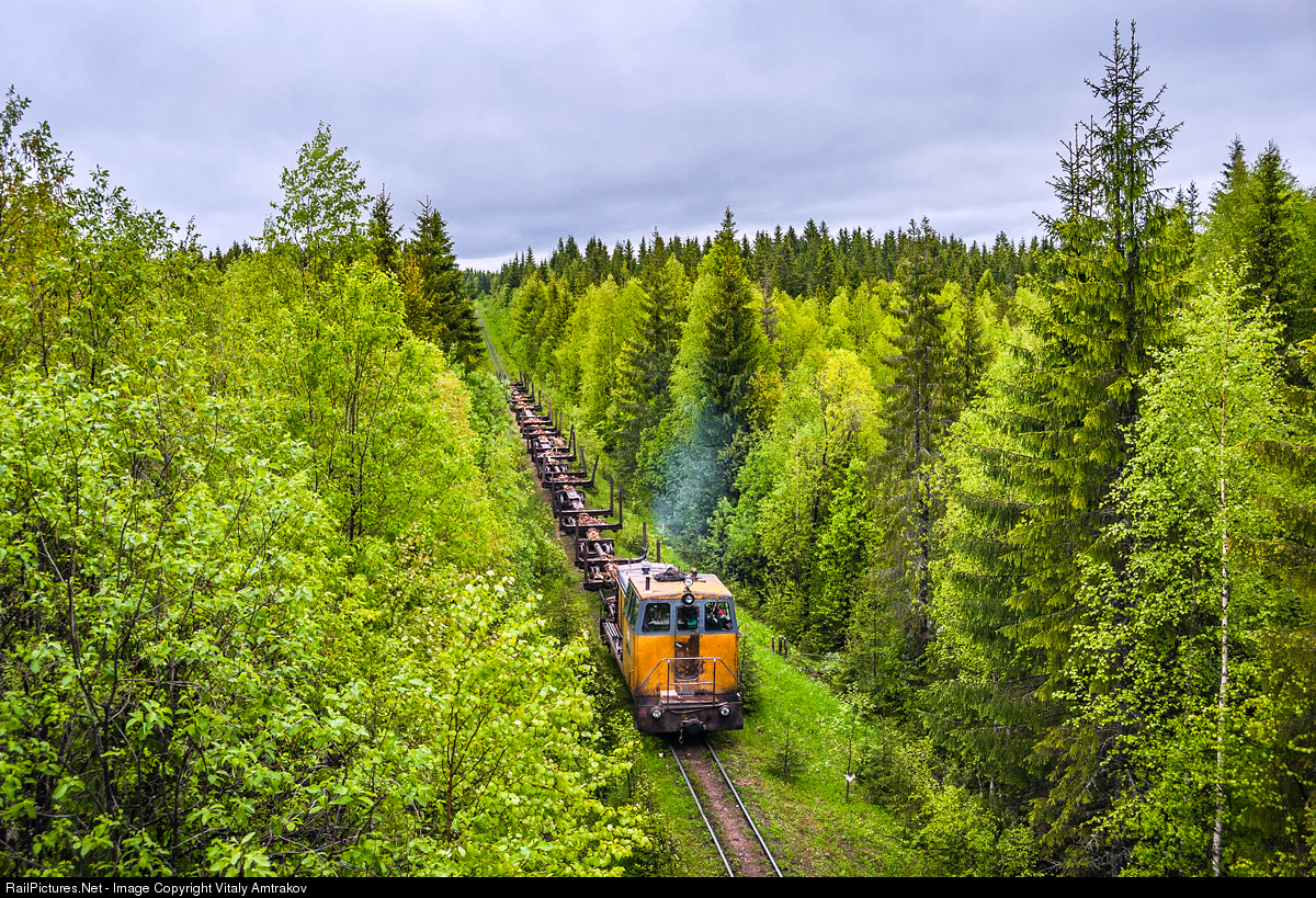 The TU6A-3487 narrow-gauge diesel locomotive is leading an empty train for loading of wood