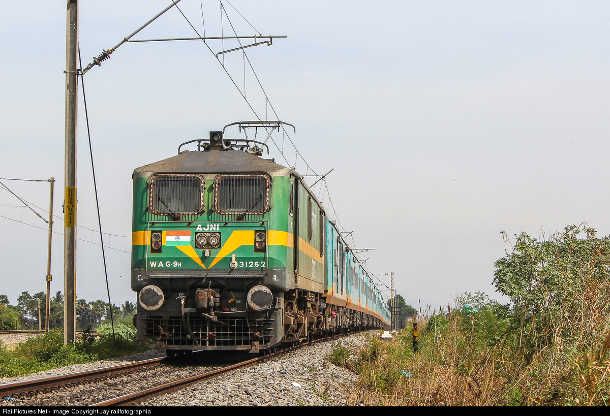 Green AJNI WAG-9H & Humsafar Express with light blue and saffron colors make a colorful consist in the morning sun as it passes Ponneri