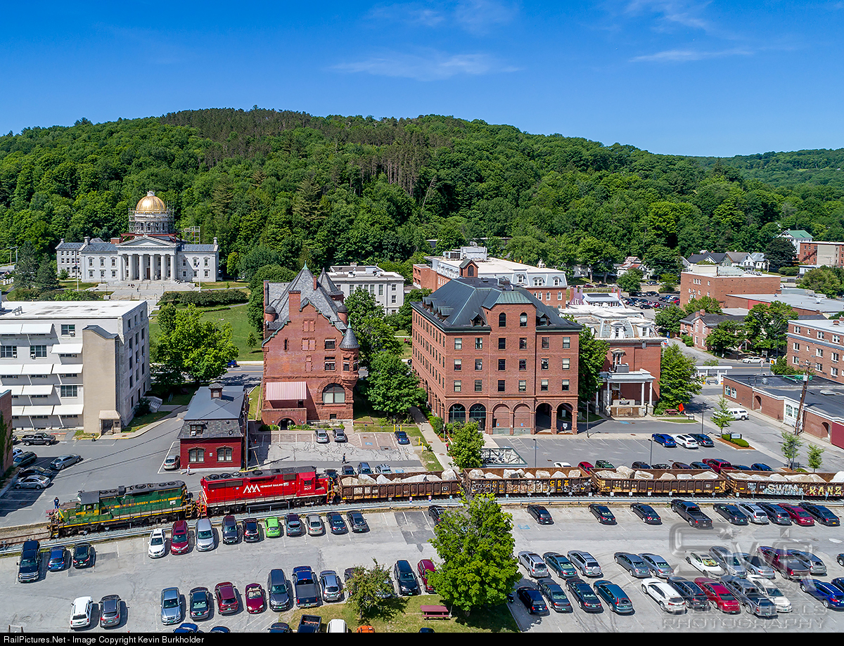 Vermont Rail System’s “Little WACR”, the Washington County Railroad affiliate Montpelier & Barre Subdivision (M&B Sub for short) re-launched granite-hauling service from the Rock of Ages Quarry in Graniteville, VT, last week with 5-day-a-week service for interchange to New England Central Railroad at Montpelier Jct., VT. On June 22, 2018, the only road unit in service in Green Mountain Railroad paint, GMRC GP9R 804, leads VTR GP40-2 307 in downtown Montpelier, with the smallest state house representing the smallest capital city in the US standing more than 160 years proud in the distance.