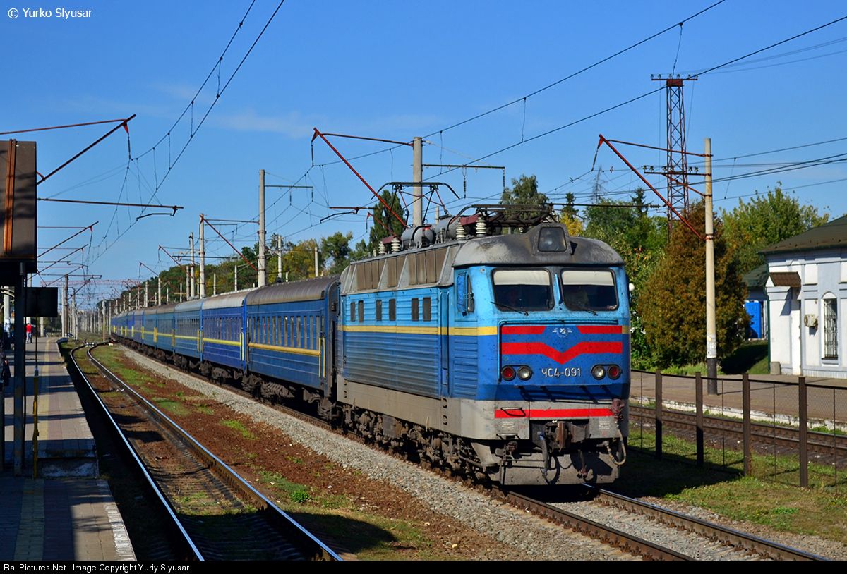 | The electric locomotive CHS4-091 with passenger train #247 Kyiv - Odesa goes through Boyrka station. This electric locomotive built by Škoda in August, 1968. Then probably in 2007 this locomotive modernized by ZERZ (Zaporizhzhia electric locomotive repair plant) with replace plastic body to steel. |