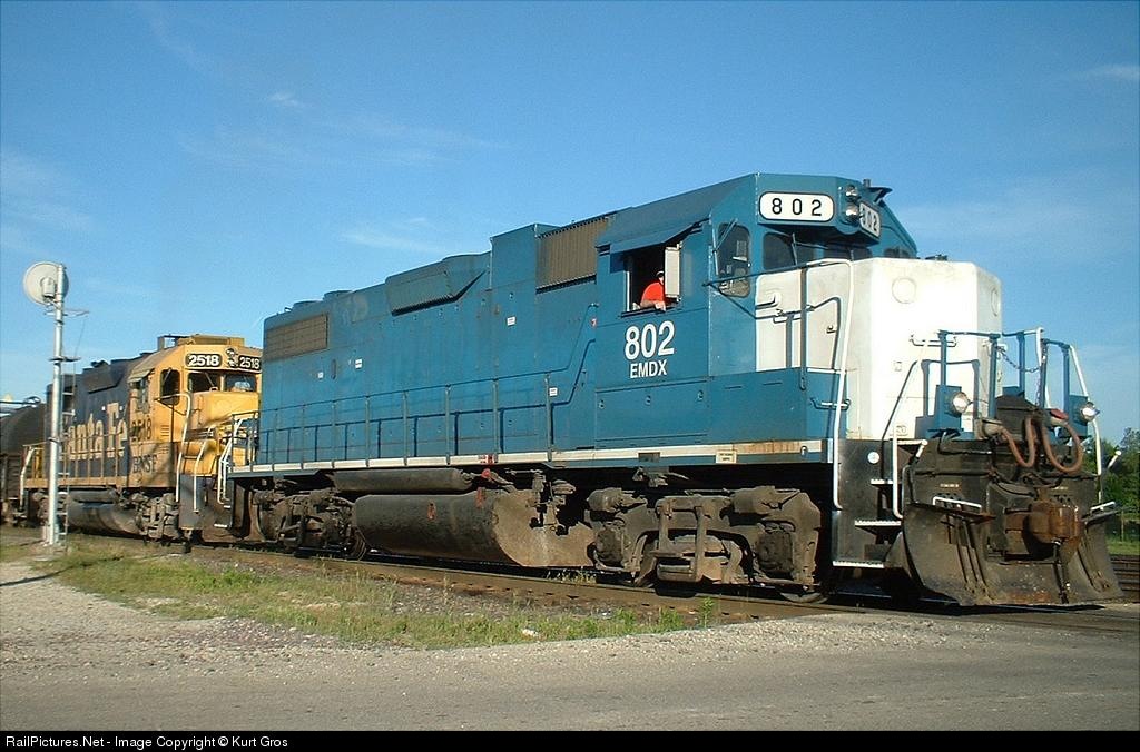 EMDX 802 pulls out of the north Eola yard to move to the south. A former ATSF GP35 follows.