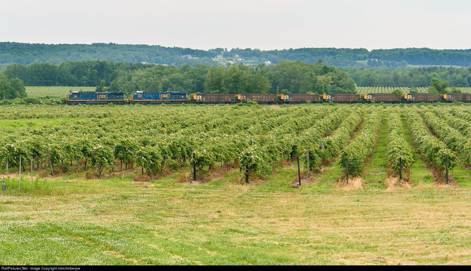 Led by two GE's, CSX coal train N616 passes through the vineyards of North East, PA with 130 loads bound for the Somerset Power Plant.