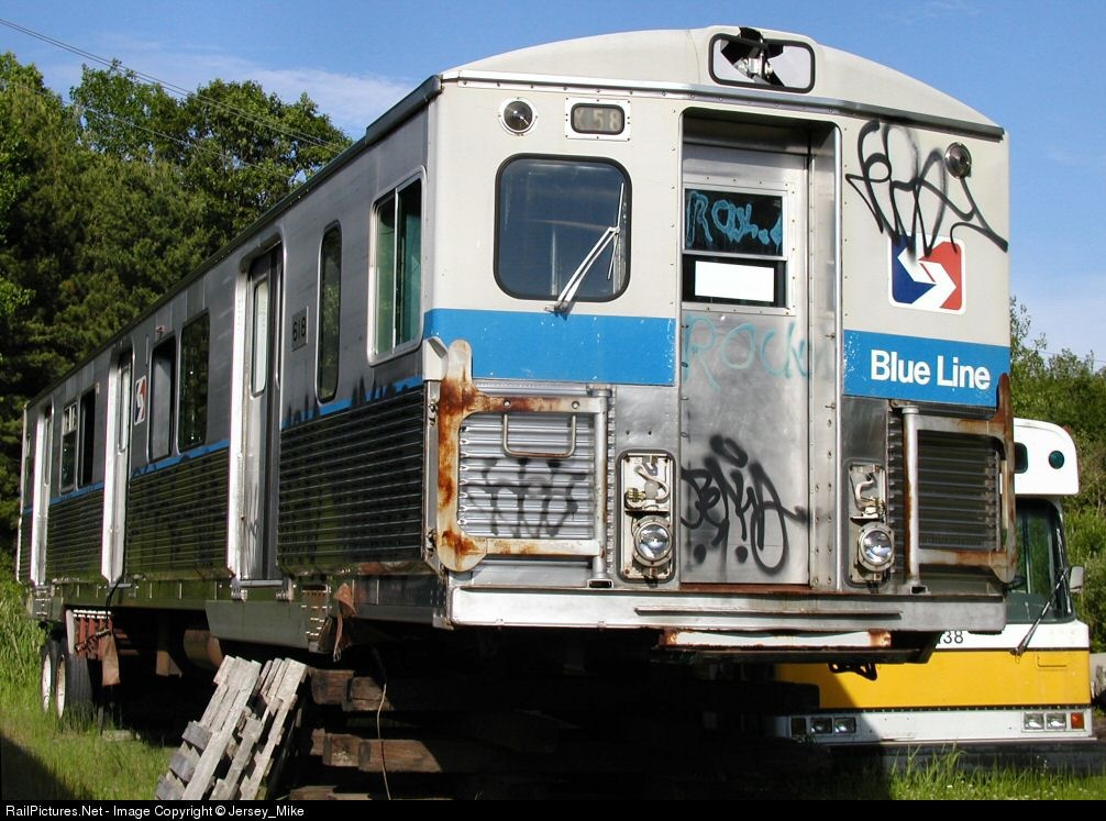 SEPTA Market Frankford Line M3 subway car still looks 'new' despite being 44 years old as it sit on blocks awaiting standard guage trucks. That Budd Company stainless steel sure retains it's shine.