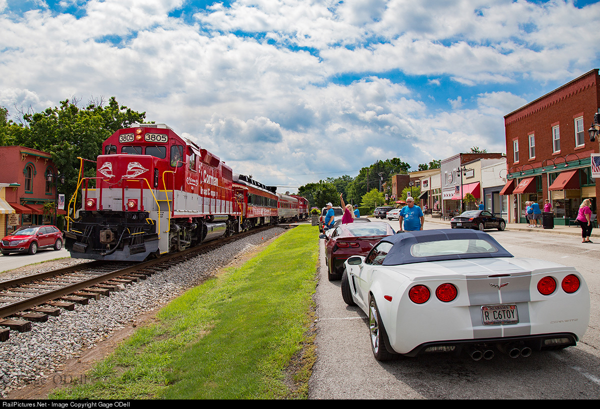 With the UK Men's Basketball team aboard and a pair of Geeps at both ends, a short RJ Corman passenger train splits the town of Midway as it passes a small Chevy Corvette meetup downtown.