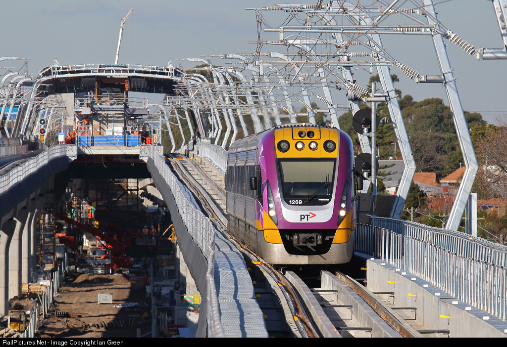 | Traversing the newly opened "Skyrail" line between Oakleigh and Caulfield, Vlocity set VL69 runs an up Traralgon service through Murrumbeena. |
