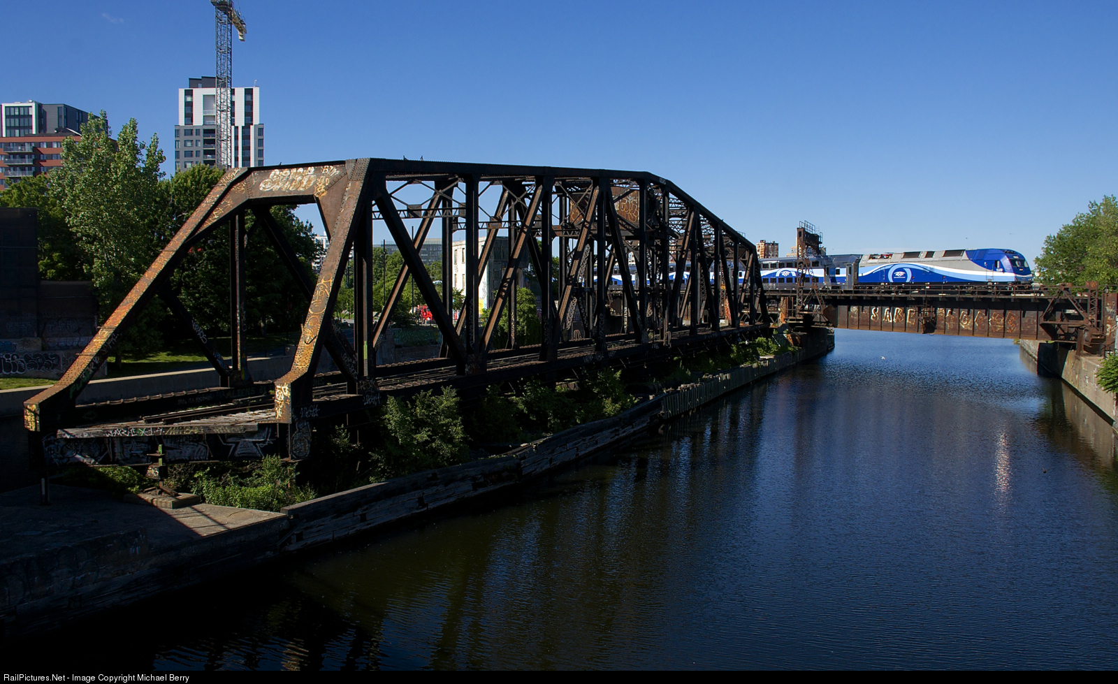 AMT 1359 leads RTM 814 for Mont-Saint-Hilaire over the Lachine Canal during the evening rush hour.
