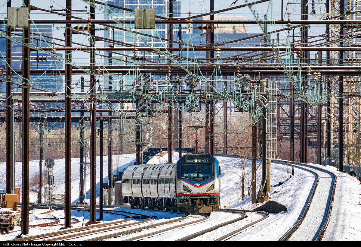 | An early morning Amtrak Regional Express sprints through Elizabeth, NJ passing a west bound fly-over track built by the Pennsylvania Railroad long ago. The "fly-over" allowed for Pennsy's higher speed passenger trains to fly over the center tracks which were used mostly for the non-stop and slower freight trains. In this case, it allowed easy access to Pennsy's P&H branch (bypass of Newark) and both Waverly and Kearny Yards. Waverly yard is no longer there, but the jump over still allows for the connection to the P&H branch without effecting moves on track 1.