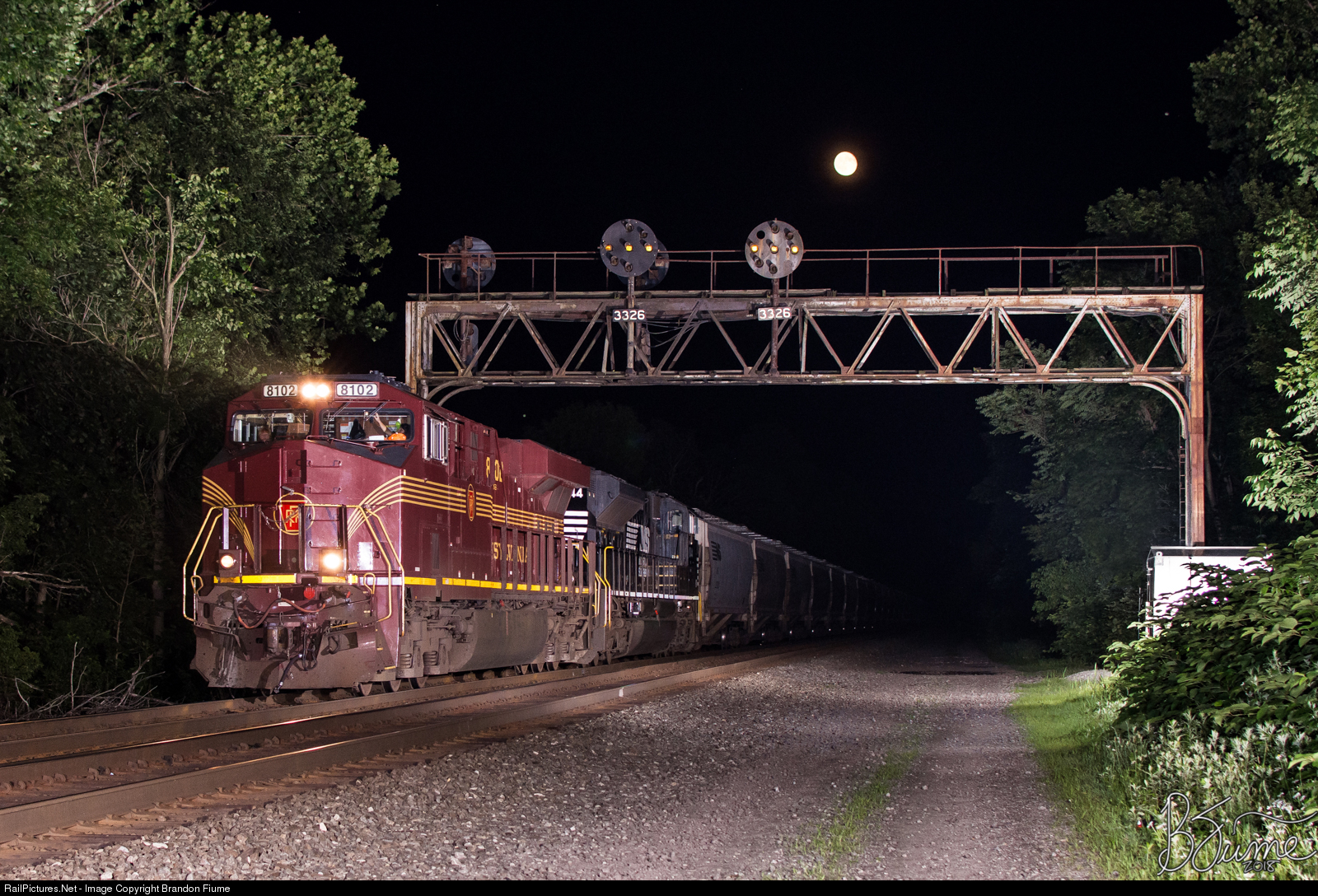 Norfolk Southern's Pennsylvania Heritage Unit leads NS 55K, an empty grain train, underneath the PRR signals in Larimer, PA under a full moon.
