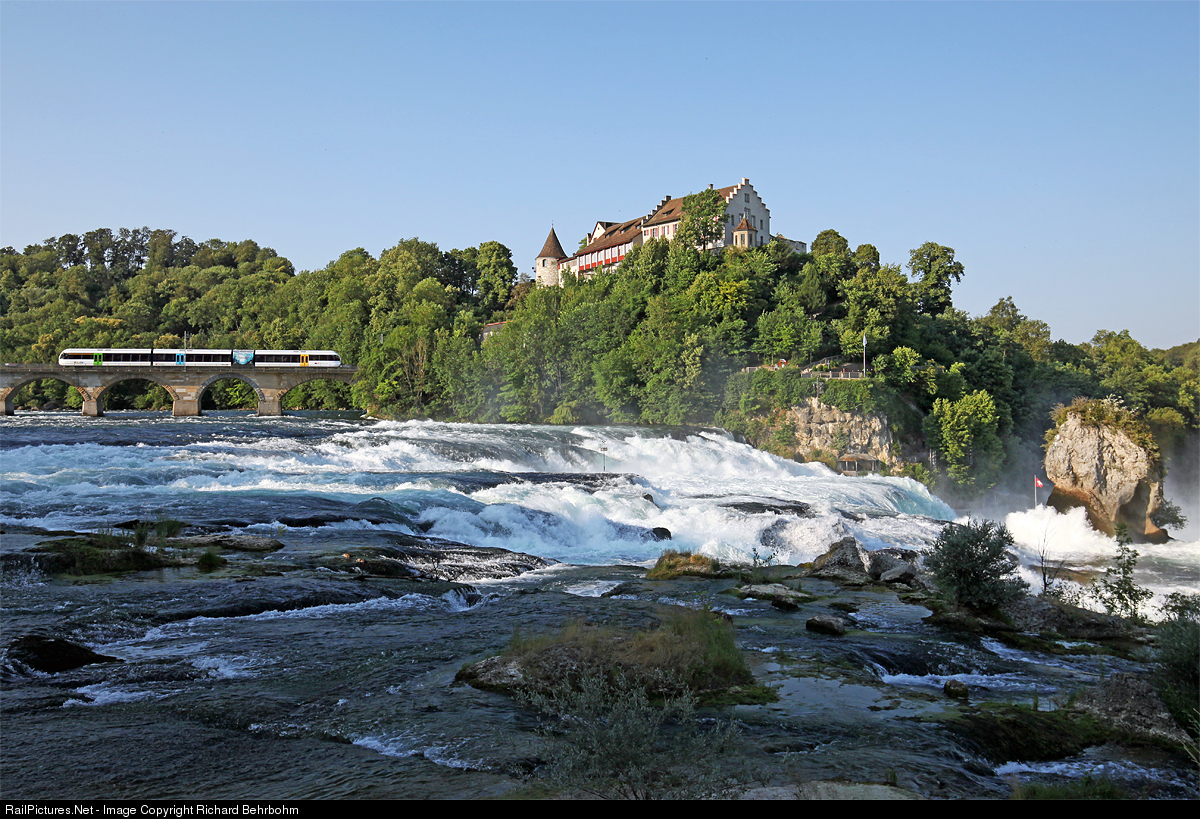 | An early summer sunday morning at the Rhine Falls. A Thurbo articulated lowfloor trainset "AKL" (long version) is crossing the bridge. |