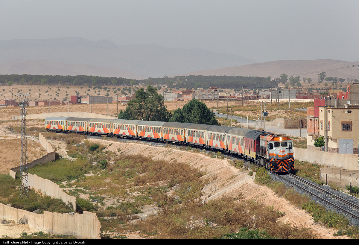The passenger train from Fes to Oujda, headed by the ONCF DH 420 locomotive, is captured as it arrives at the town of El Aioun.