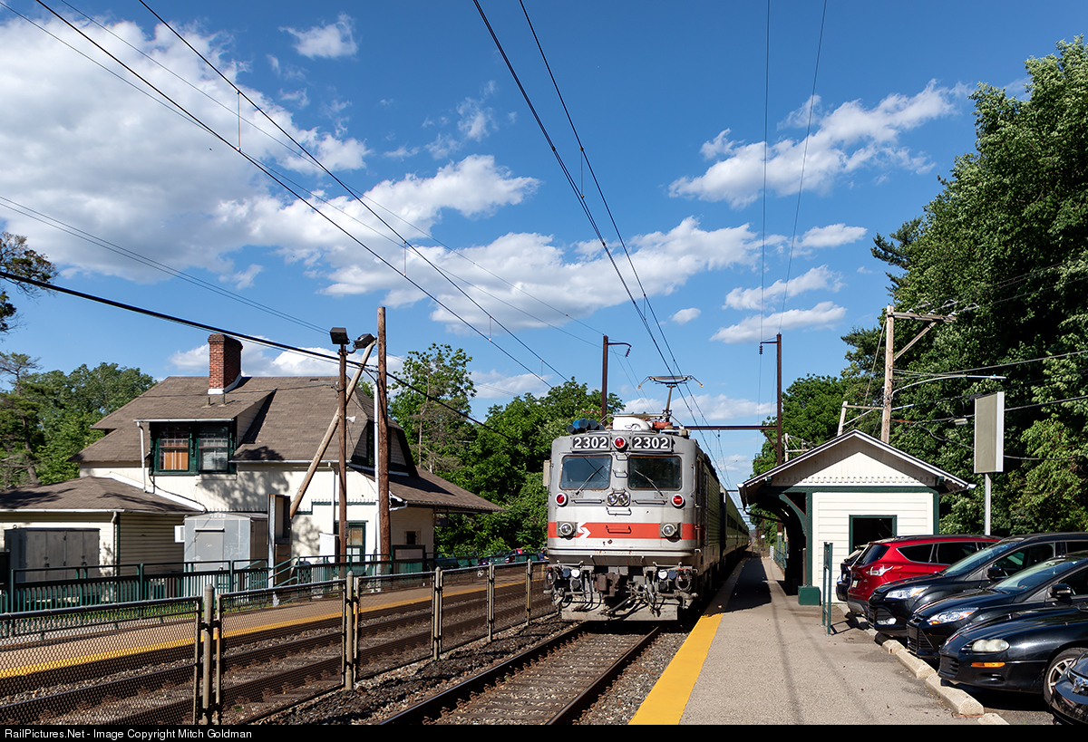 | A late afternoon express pushed by a SEPTA AEM-7 makes its way east towards West Trenton, NJ passing the in service Reading built Rydal station. The 1888 built station also serves a private business and the US Post Office. |