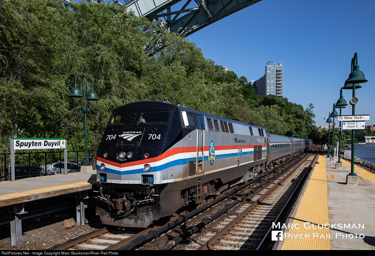 | Amtrak 704 (P32AC-DM) leads train 237 past the Spuyten Duyvil Station in the Bronx, NY on Friday, June 29, 2018. |
