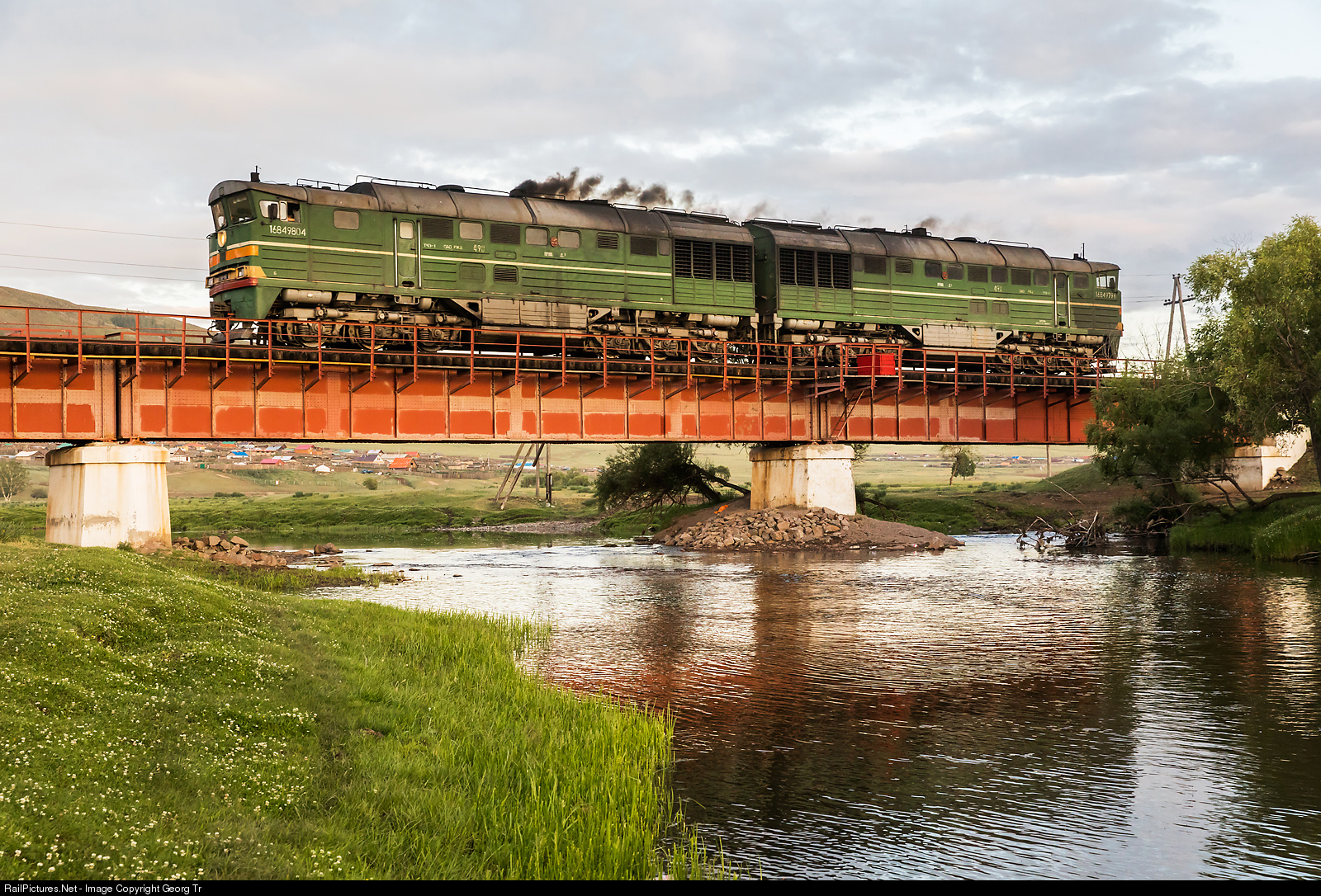 2TE116 # 490 double locomotive of the russian RZD is crossing the bridge over the Charaa river at Bajanbüüral (Km 300) in the Schatan mountains. Because of power shortage, the Mongolian Railways rented several locomotives from Russia, they are running north of Ulaanbaatar mainly.