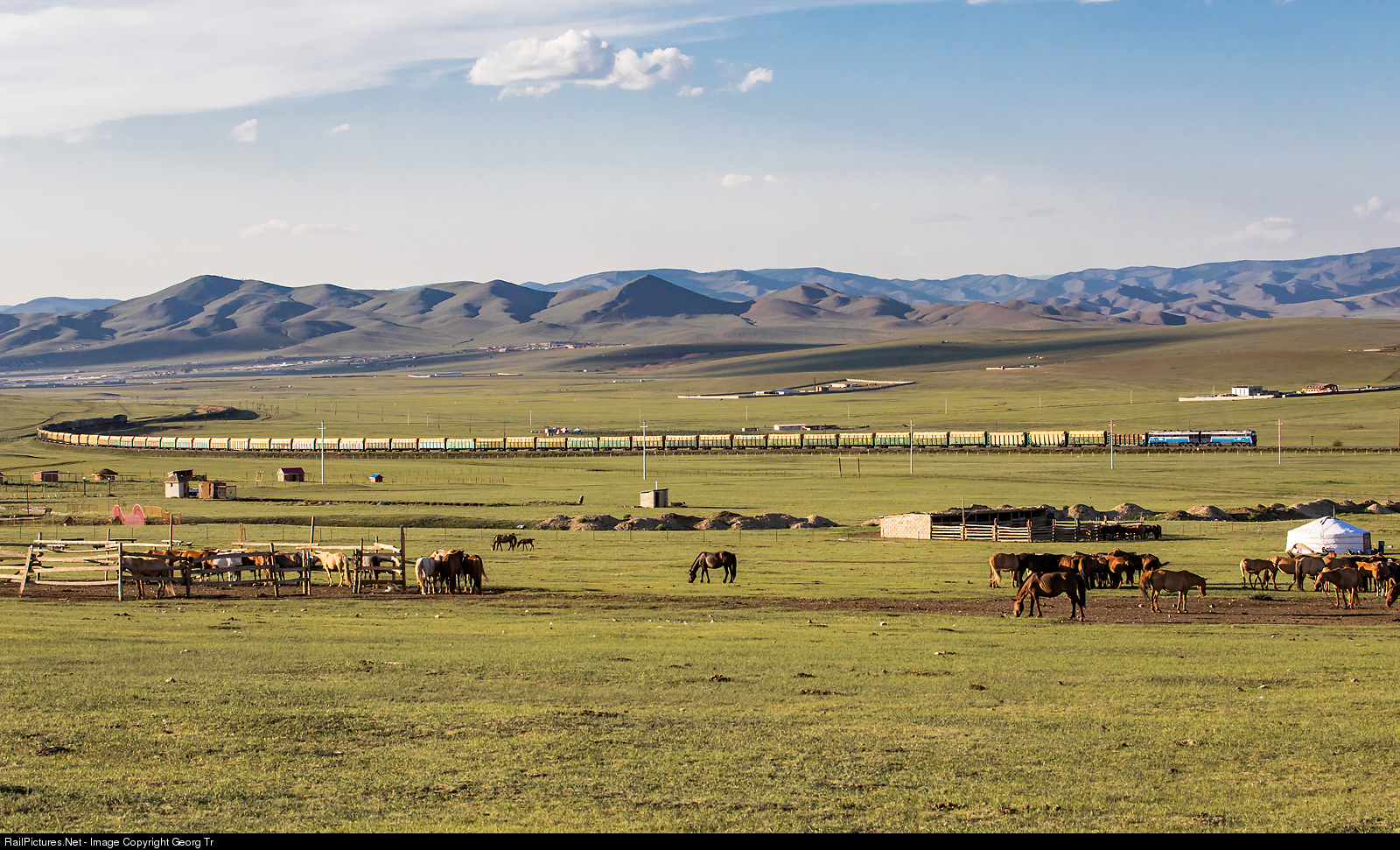 7200 horsepower double diesellocomotive 2TE116UM # 014 of the Mongolian Railway is pulling a long, heavy 5000 ton wood train from Russia to China on the transmongolian line south of Ulaanbaatar, between Bümbat and Baian. In the rear a half 2TE116 of the RZD, rented by the Mongolian Railway, is shoving. 31 of the 2TE116UM series were built from 2010 by the Luhansk locomotive works (Ukraine) for the Mongolian Railways.