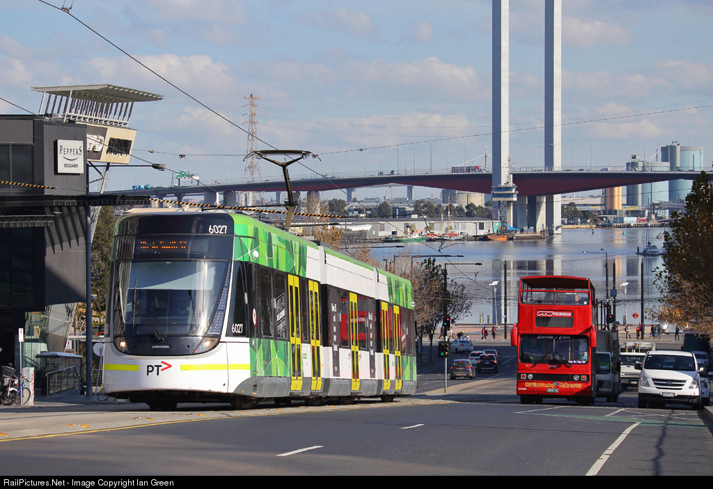 E class tram 6027 on the route 86 races a tourist bus up the grade in La Trobe Street near Docklands.