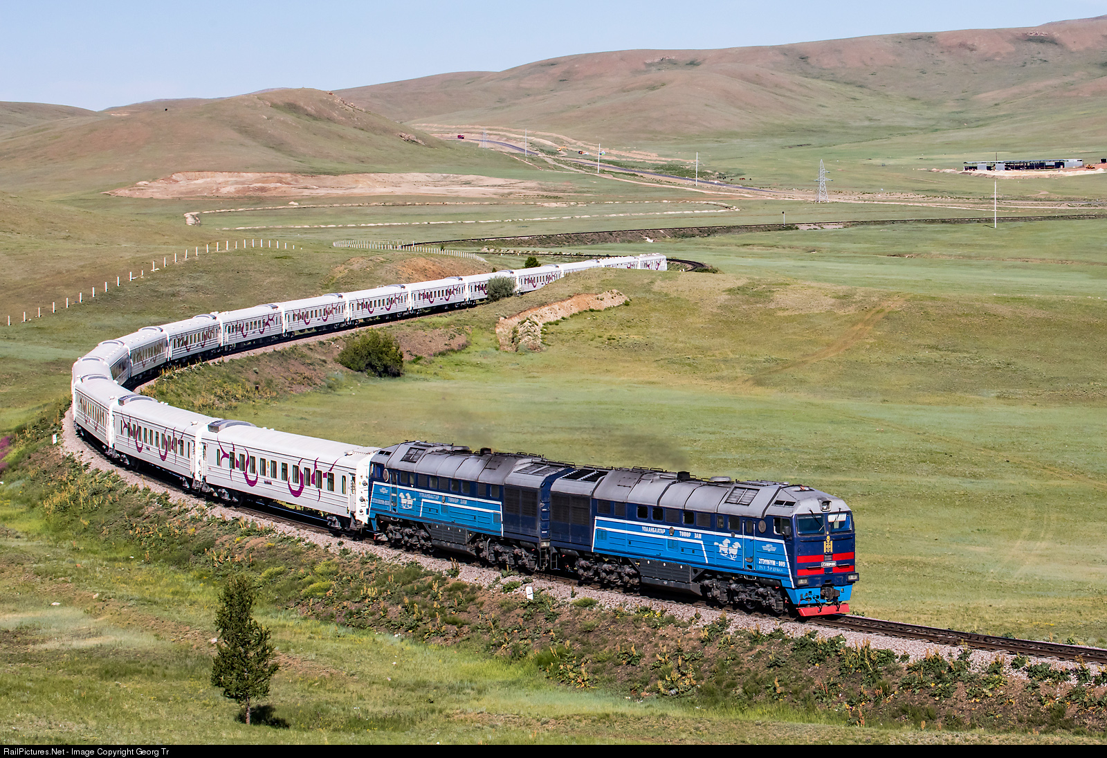 | 2TE116UM # 009 of the Mongolian Railway is pulling train 24 from Ulaanbaatar to Beijing (1548 kilometers in 28 1/2 hours, with two long stops at the border) between Baian and Chaichai. All 16 cars are new built in China and for 140 km/h maximum velocity. Train # 24 circulates on thursday from Ulaanbaatar with this mongolian cars, on friday with chinese cars. |