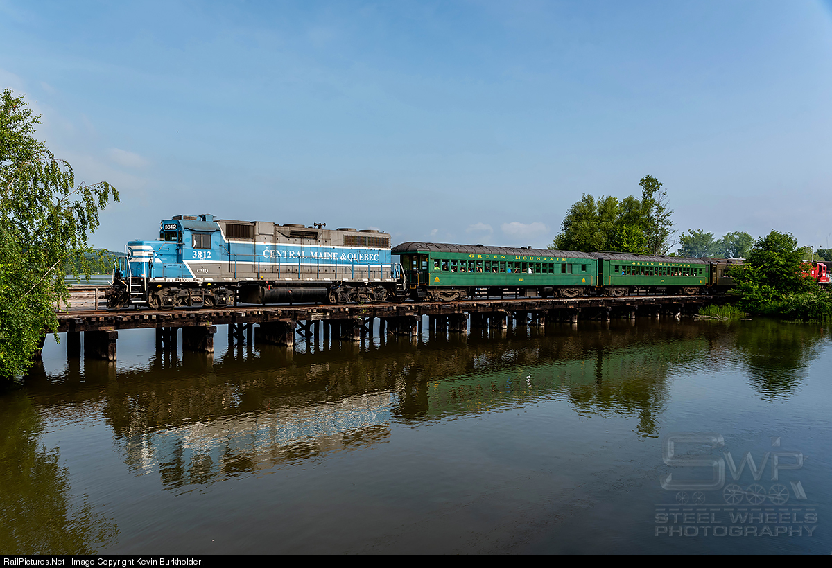 Newport, Vermont is holding a Centennial Celebration in 2018 and on July 1, hosted a series of special excursions on Central Maine & Quebec and Vermont Railway trackage as part of the events. CMQ GP38M-3 3812 is leading a trio of Green Mountain Railroad passenger cars, along with Vermont Railway GP40-2 303, cross the confluence of Lake Memphremagog and the Clyde River over a low trestle on the way to Orleans for a round trip.