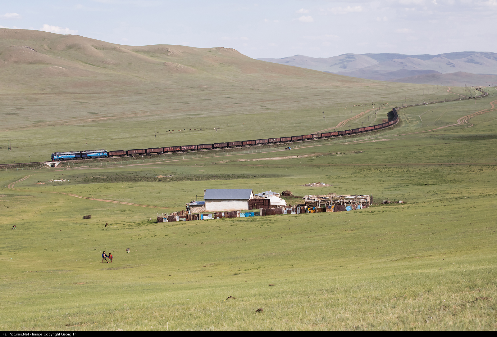 2TE116UM # 011 with a northbound loaded coal freight on the transmongolian line between Baian and Bümbat. The coal is destined for the power station of Ulaanbaatar and comes from a branchline in the south of Mongolia. Two boys and a dog are nearing curiously the photographers.