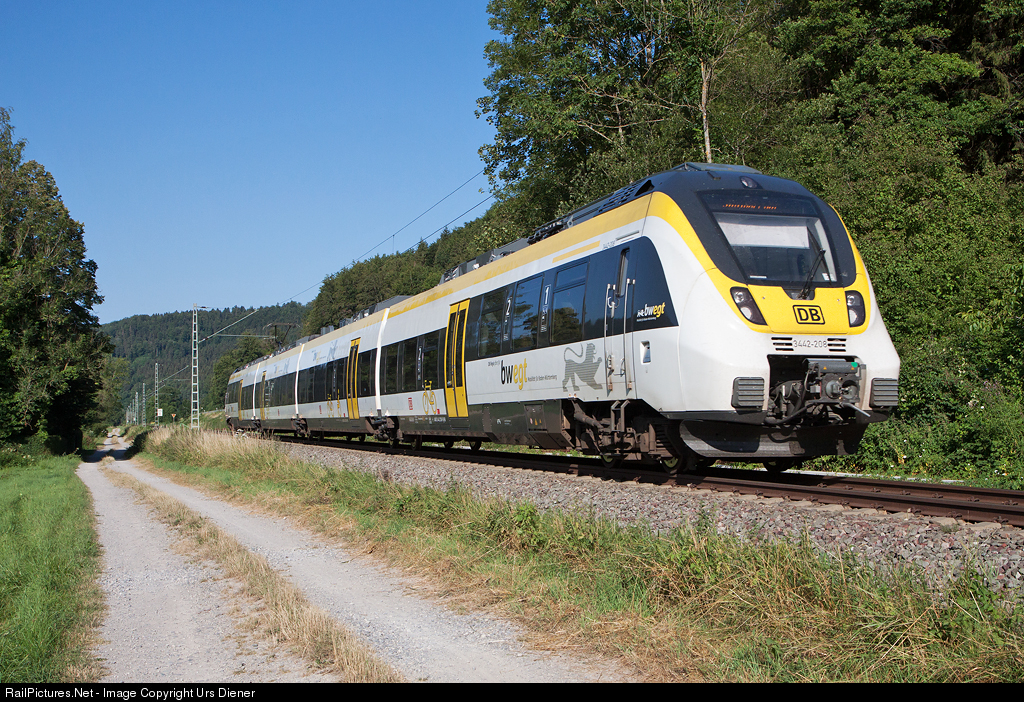 | Commuter trainset 3442 208, painted in the colors of the province Baden-Württemberg, on the way from Rottweil to Stuttgart. |