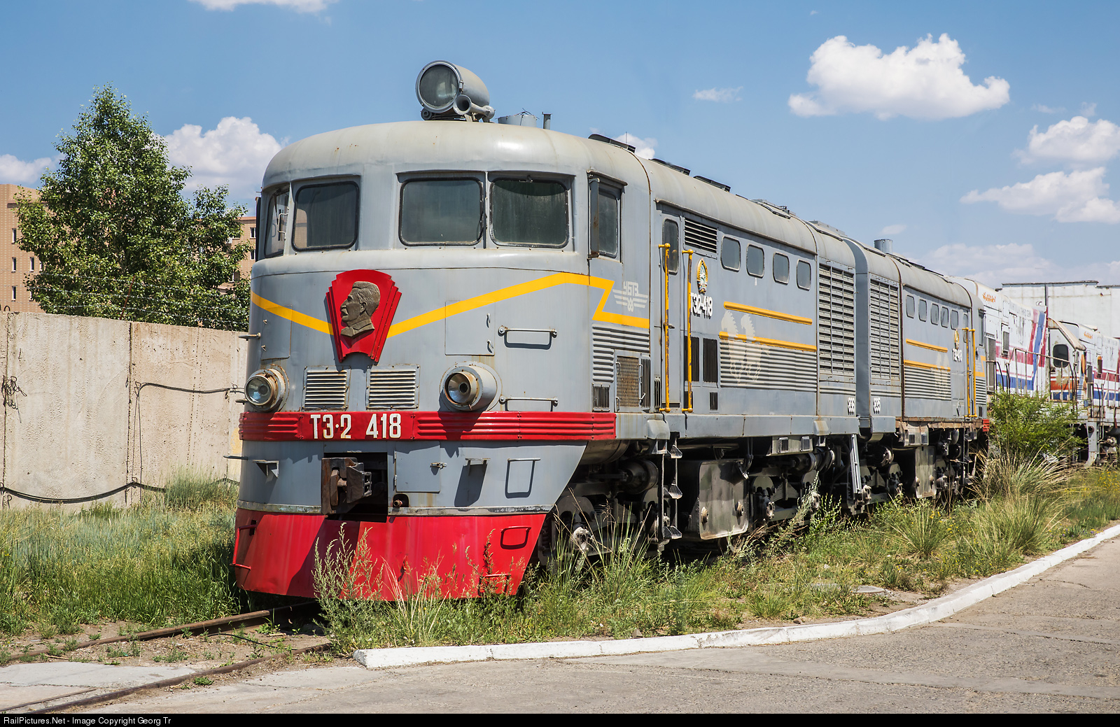 8 axle double diesellocomotive TE2 # 418 of the Mongolian Railway, stabled in the shed area, more or less operational. The locomotive was built by Charkov locomotive works in the Soviet Union in the 1950' in a series of 528, has 2000 HP and run up to 100 km/h. After withdrawel by the RZD, the locomotive was used in Mongolia. On the front is a portrait of former soviet dictator Stalin.
