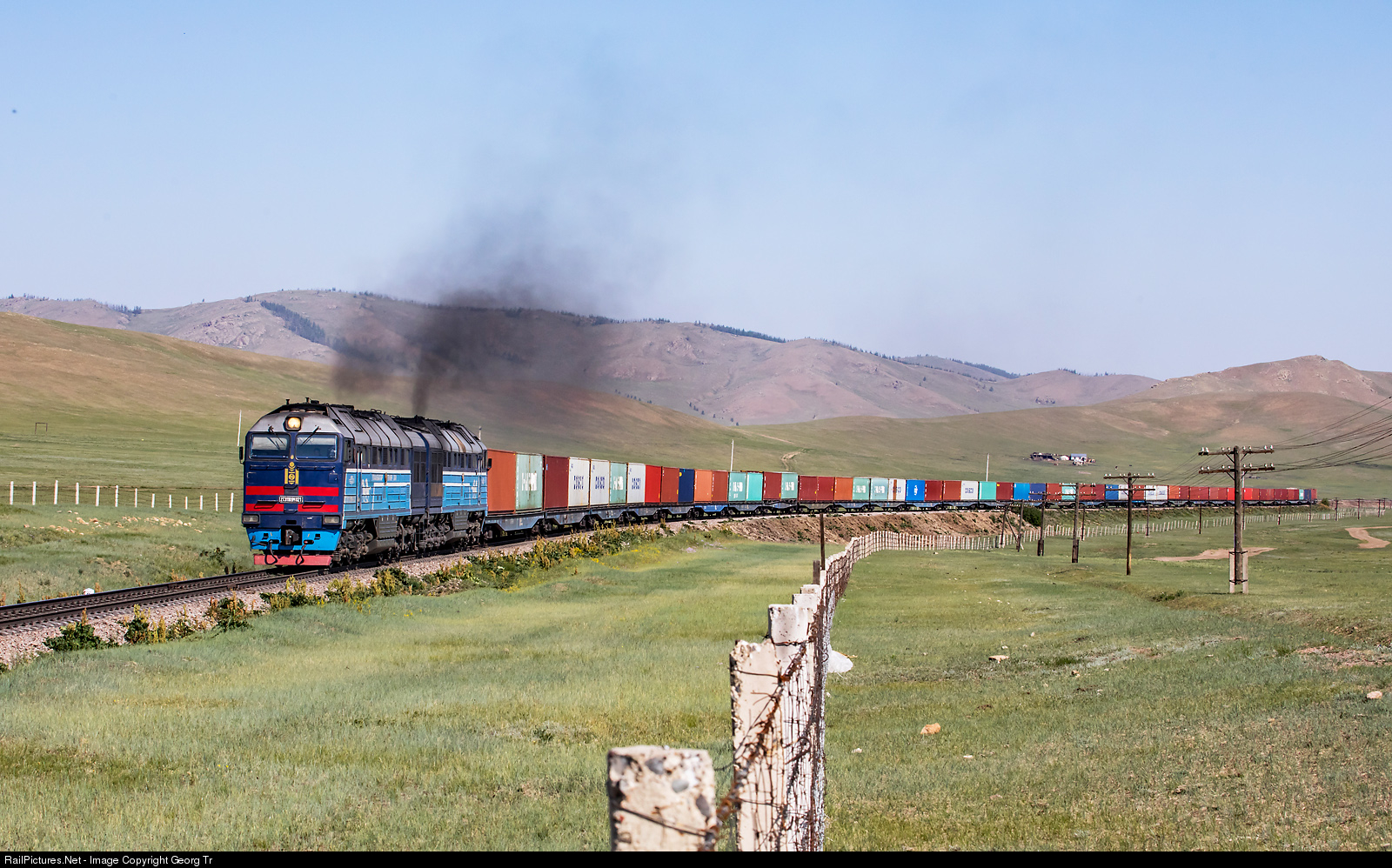 2TE116UM # 021 double locomotive is pulling a long southbound container train on the transmongolian line between Bümbat and Baian stations. About one third of the length of the train is covered behind an S-curve and not visble. The transmongolian railway is fenced throughout with barbwire, to protect animals from the track. These fences are checked daily for damage.