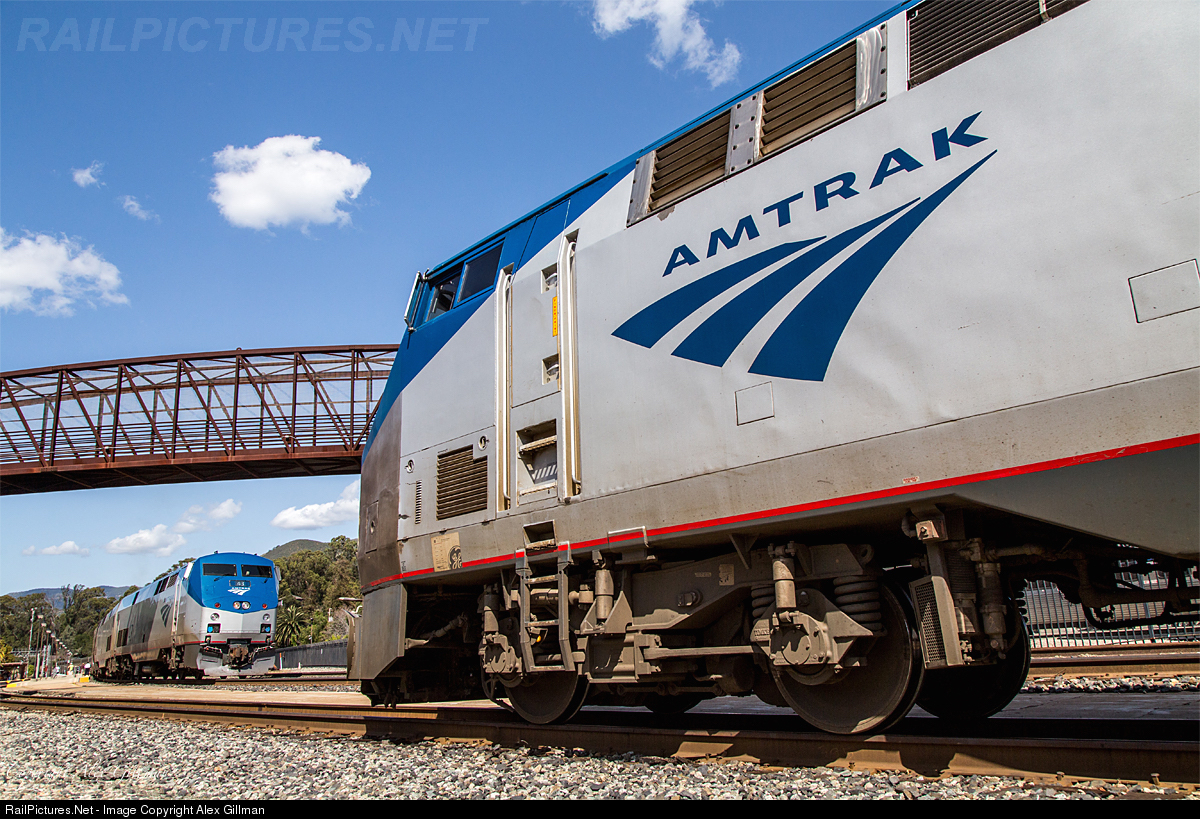 | A daily ritual takes places at the San Luis Obispo station as Amtrak 14, the northbound Coast Starlight, patiently waits just short of the platform for its southbound counterpart to finish its station work before pulling in to perform its own. While the meeting of these two trains is often at or near the station here, planning where to set up one's shot can be difficult especially when you never know where the engineer will spot the train that will be waiting short of the depot. Luck was on my side on this day as the engineer of 14 pulled his train as close as possible to the platform allowing me this shot. |