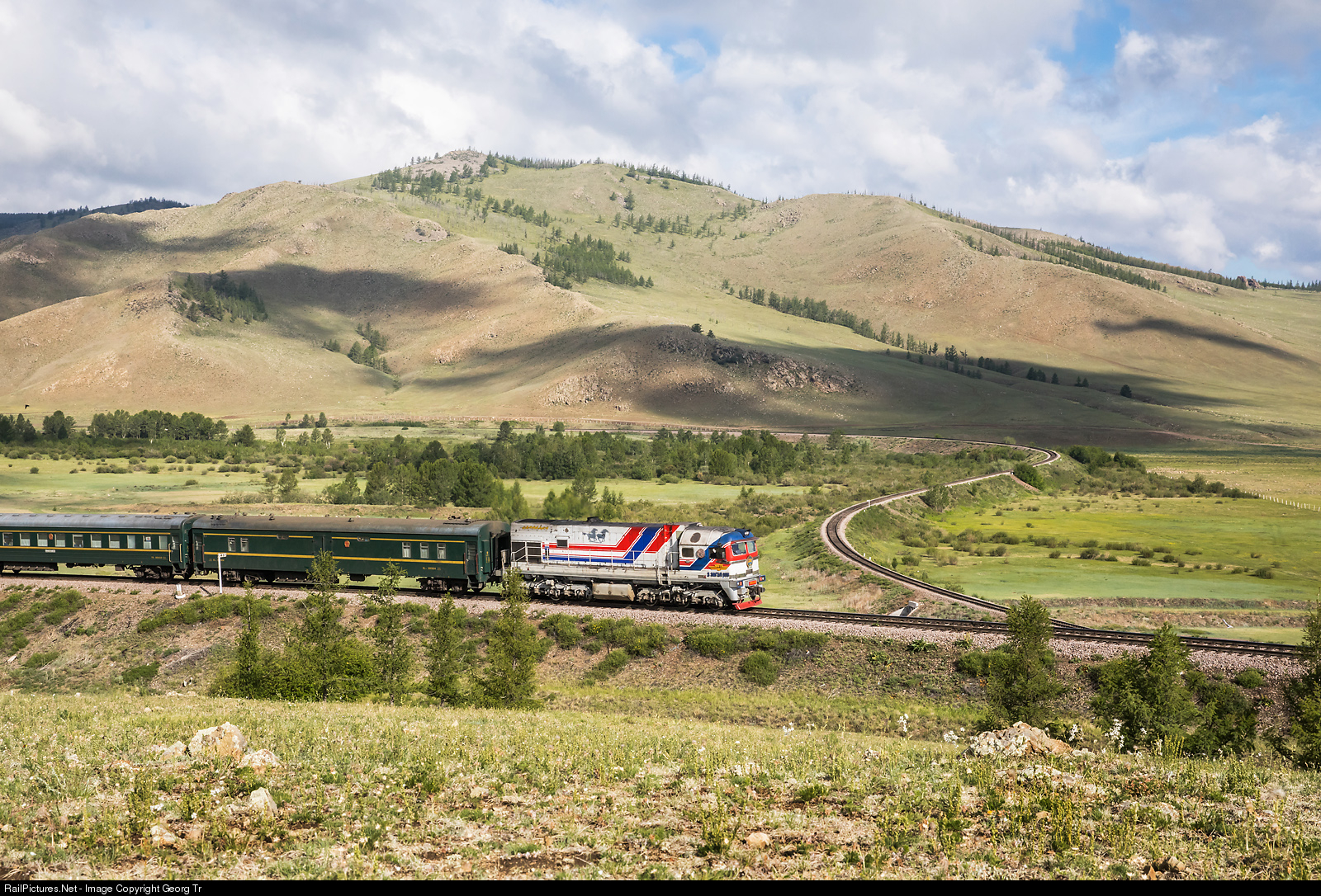 Only one half of a 2ZAGAL locomotive, # 009, is pulling the famous 11 car train # 4 "Trans Siberian Express" from Moscow to Beijing (7622 kilometers) through the loop of Khonkhor. It is sunday morning 08.14 AM now, the once a week train started at Moscow Yaroslavski station on tuesday evening 11.55 PM and will arrive at Beijing main station the following day (monday) at 11.40 AM. The cars are from the chinese railway, excluding the dining car, which is from Mongolia on this part of the journey. On this place at the omega shaped loop, the distance between the two tracks is 80 meters only, the difference in height about 12 meters. The grade of the line is around 0.7 %.