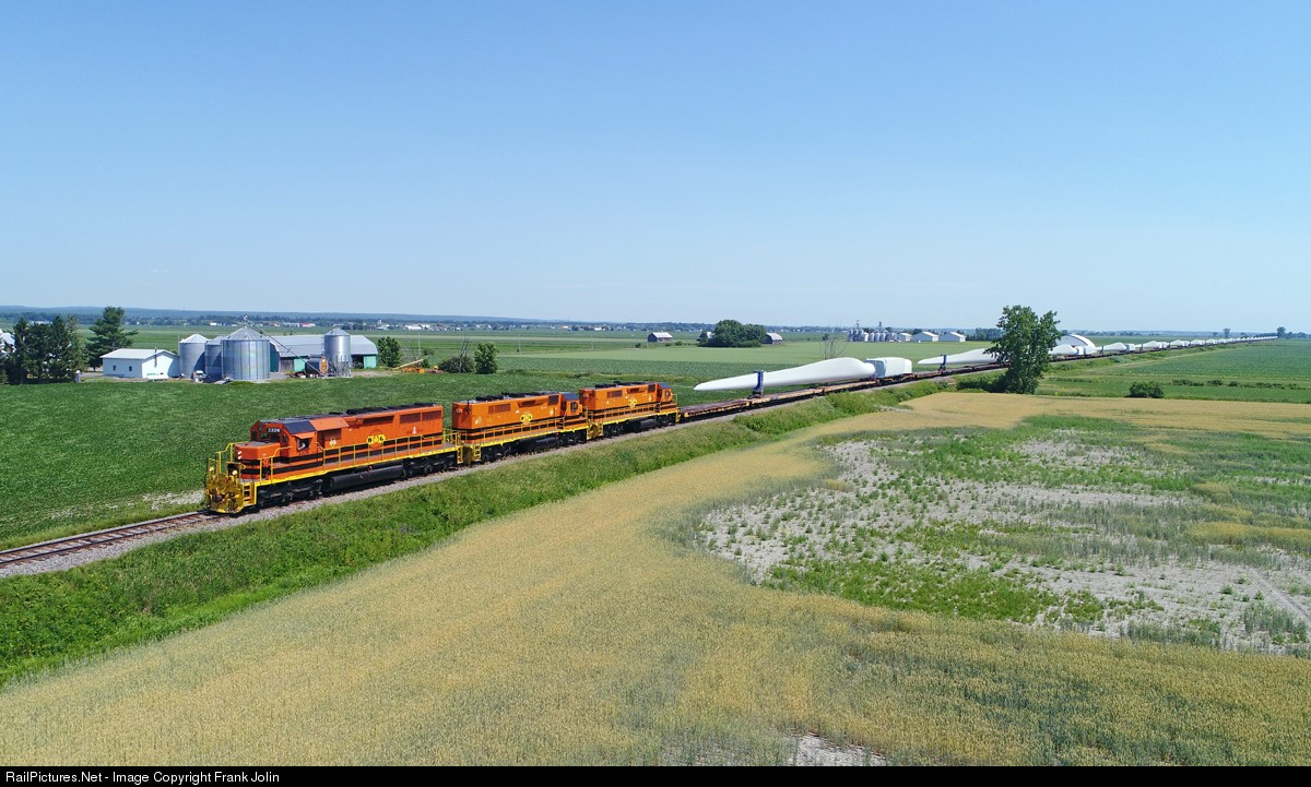 | Originating in Trois-Rivières, Quebec Gatineau 3326 West with wind turbine blades and nacelles is heading toward the Canadian Pacific interchange at St Luc Yard in Montreal on another hot and humid July morning. |