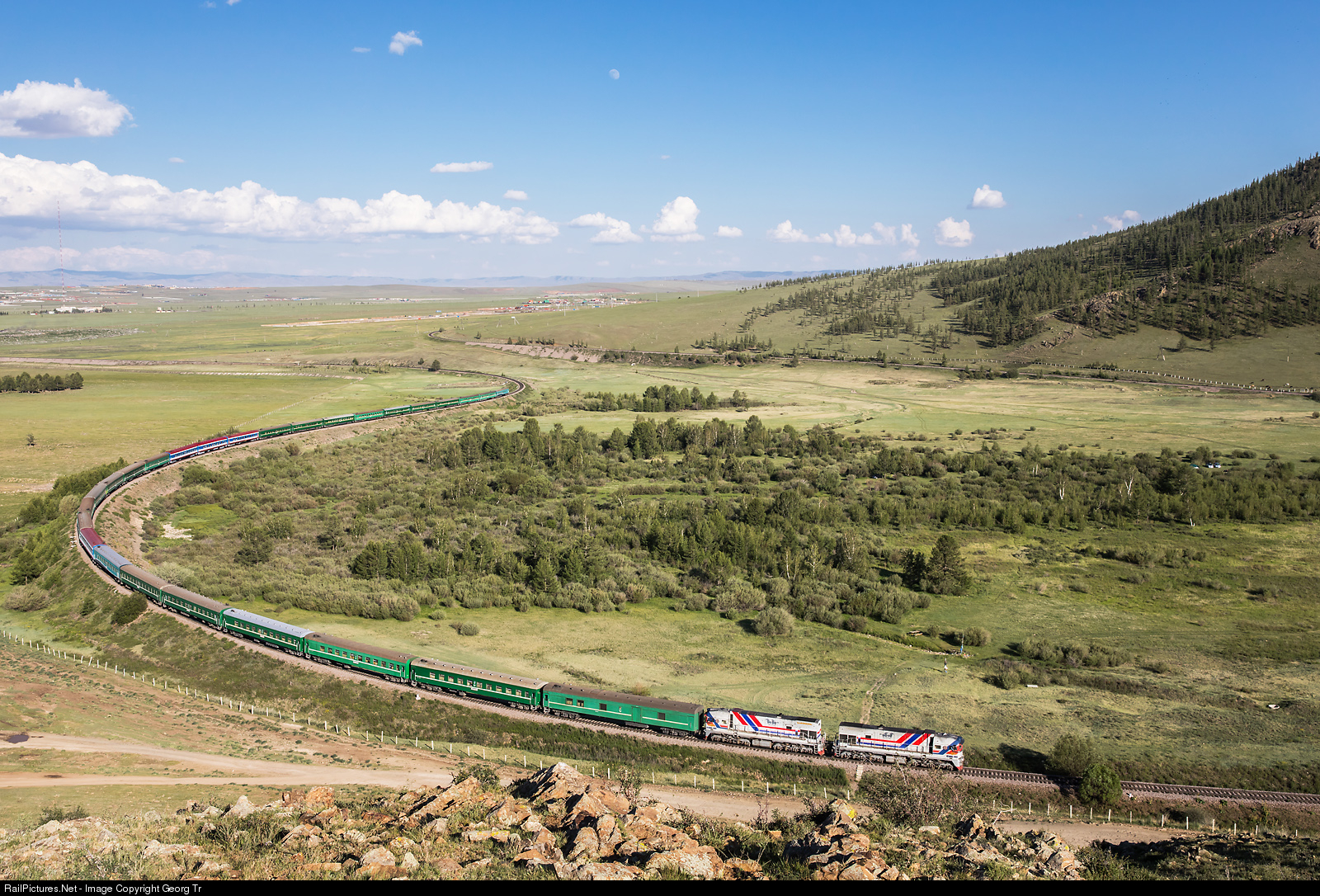 | 2ZAGAL # 003 twin locomotives are pulling the long 27 cars train 276 from Ulaanbaatar to Zamiin Uud (near the border to China, 709 kilometer from Ulaanbaatar) through the Omega shaped Khonkhor loop on the Baian pass. The line is going in the opposite direction on the other valley slope below the white poles of the fence. The grade through the loop is slightly only, about 0.7 %. |