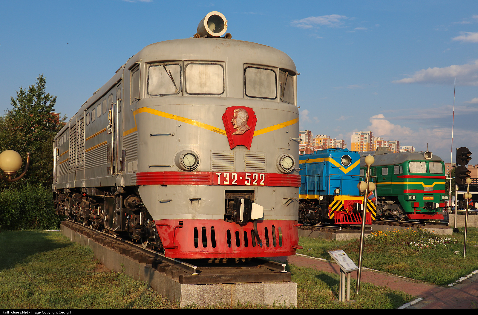 8 axle double diesellocomotive TE2 # 522 of the Mongolian Railway in the railway museum of Ulaanbaatar. The locomotive was built by Charkov locomotive works in the Soviet Union in the 1950' in a series of 528, has 2000 HP and run up to 100 km/h. After withdrawel by the RZD, the locomotive was used in Mongolia. On the front is a portrait of former soviet dictator Stalin.
