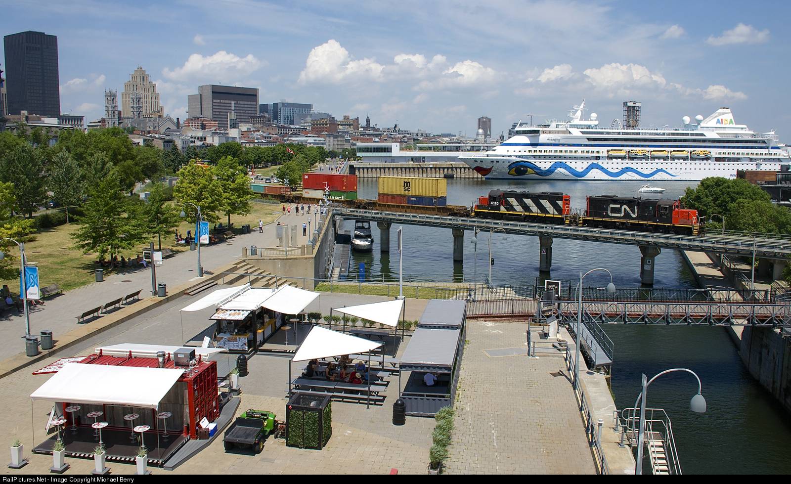 A cruise ship in the background. Cruise ship AIDAvita is docked in the Port of Montreal as GP9's CN 7054 & CN 4115 pull some intermodal traffic and baretables destined for track 29 over the Lachine Canal on a sweltering day.