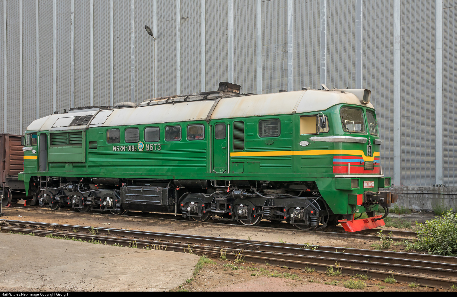 Diesellocomotive M62M # 018 of the Mongolian Railway (Mongolyn Tömör Zam, MTZ) in the depot of Ulaanbaatar. From 1980 till 1990 MTZ received 13 single units M62UM and 66 twin units 2M62M.