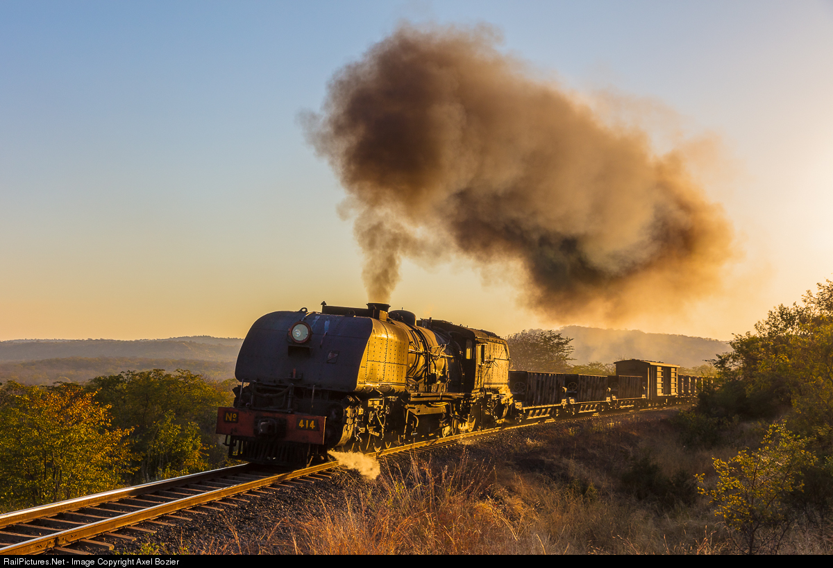 | NRZ's Garratt Class 15A 4-6-4+4-6-4 steam locomotive #414 "Ubhejane" ("Black Rhinoceros"), pulling a freight train, is charging in the gradient between Sambawizi and Zanguja in the last Golden evening light. |
