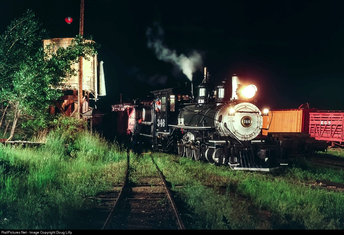 | Surrounded by preserved narrow-gauge freight cars, Denver & Rio Grande Western 2-8-0 346 pauses by the No Agua water tank at the Colorado Railroad Museum. The museum hosted a special night session on Memorial Day weekend, 1985. |