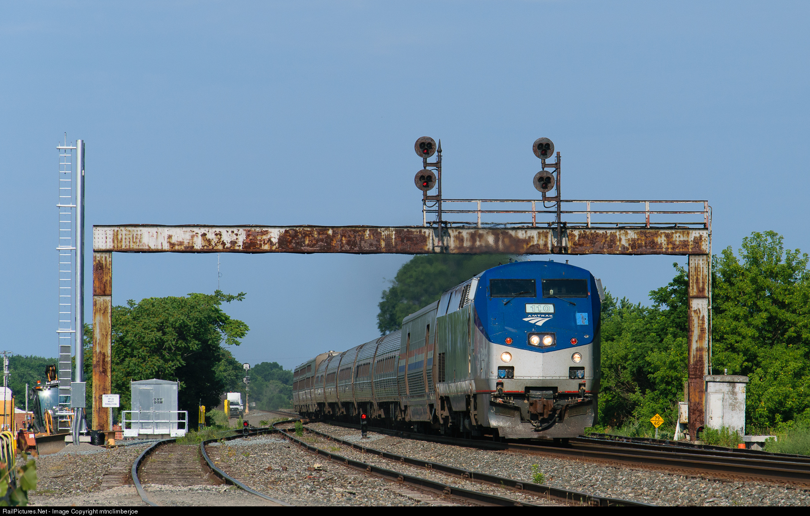 The first support for the new signal bridge is now in place at CP 39 in Dunkirk as Amtrak's Lakeshore Limited passes under the NYC bridge currently guarding the interlocking on the Fourth of July.