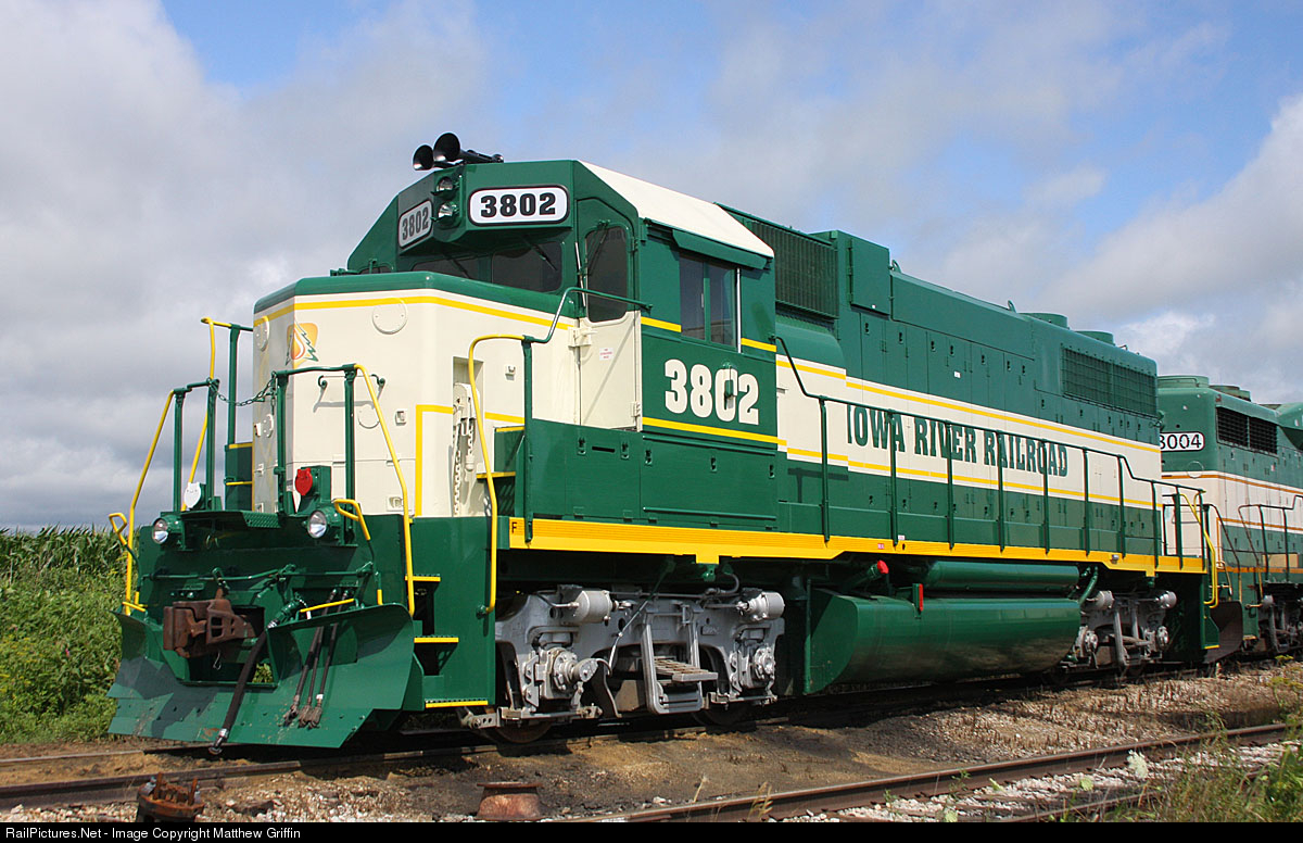 The Iowa River Railroad in Cleves, IA recently acquired a new GP38. This small operation runs up to the junction with the CN at Ackley.