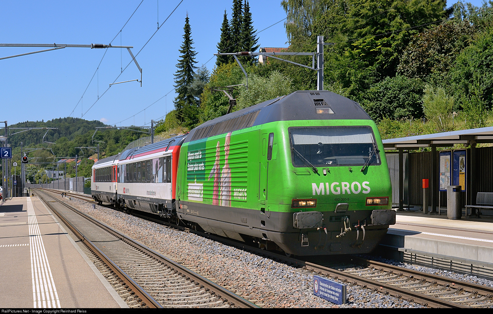 | 460 080 in commercial livery "MIGROS" passes Jestetten station with a track measuring train in direction to Schaffhausen. |