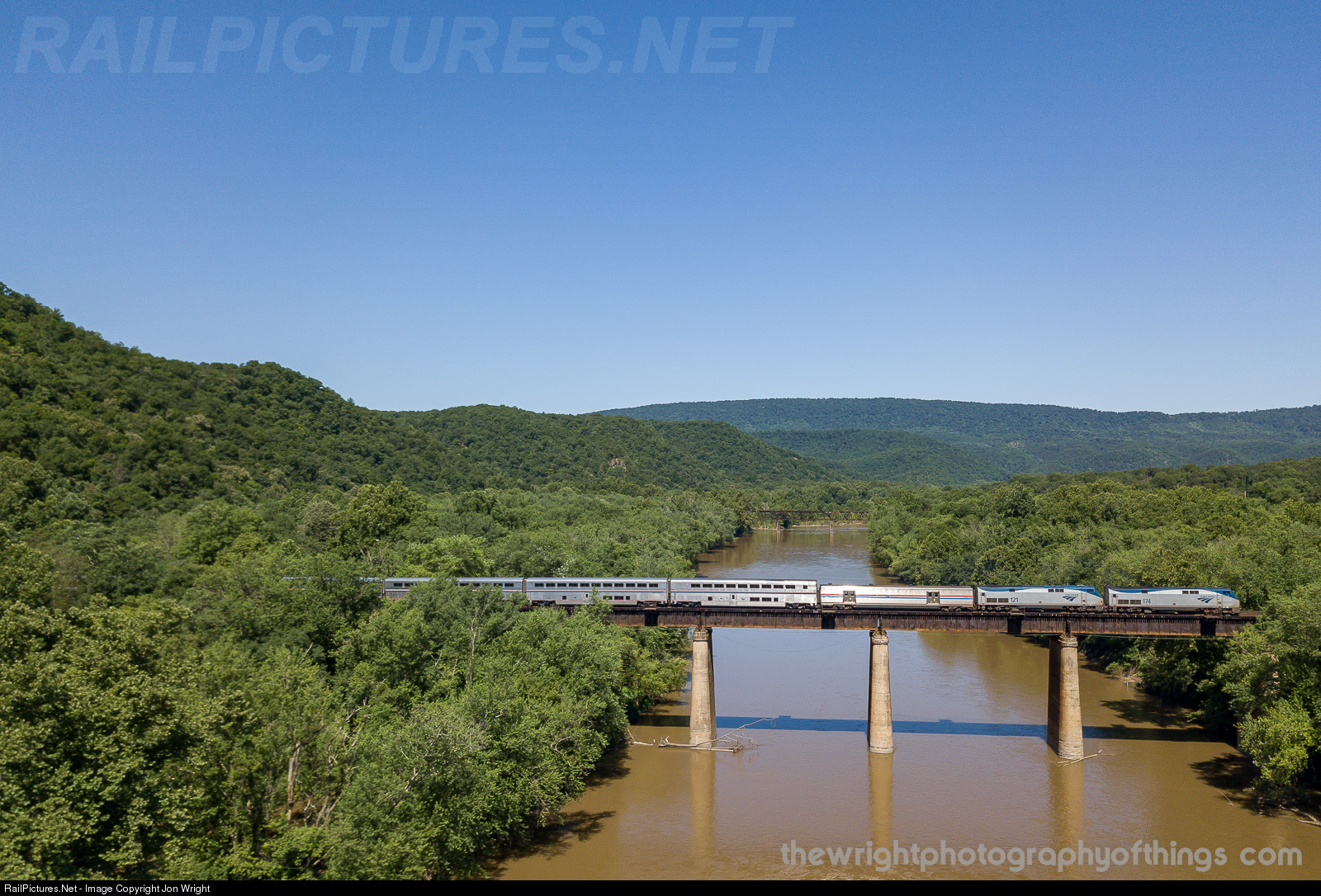 | Crossing over the swollen Potomac River along the Magnolia Cutoff is the eastbound Capitol Limited. A month ago, this area received a tremendous amount of rain and the river itself was out of its banks up to the bottom of the trees. The old Western Maryland Railway bridge can be seen downstream. |