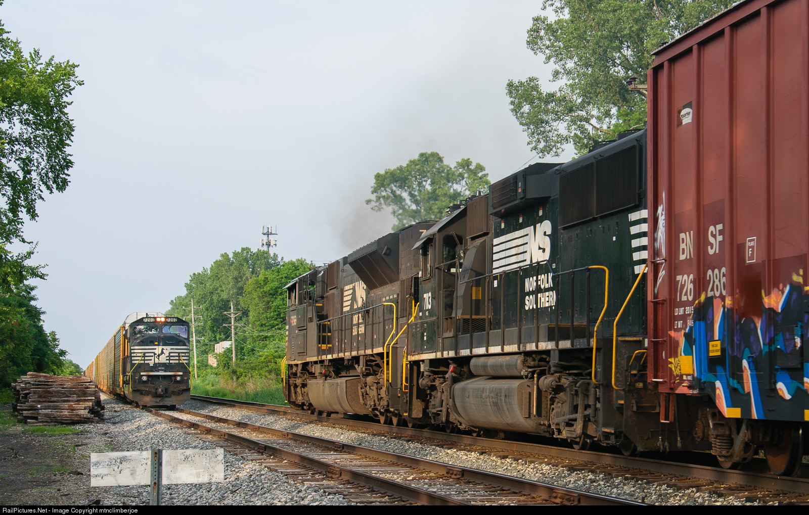 Led by an SD70ACU, NS manifest freight 316 meets auto train I87 at the Swanville Control Point.