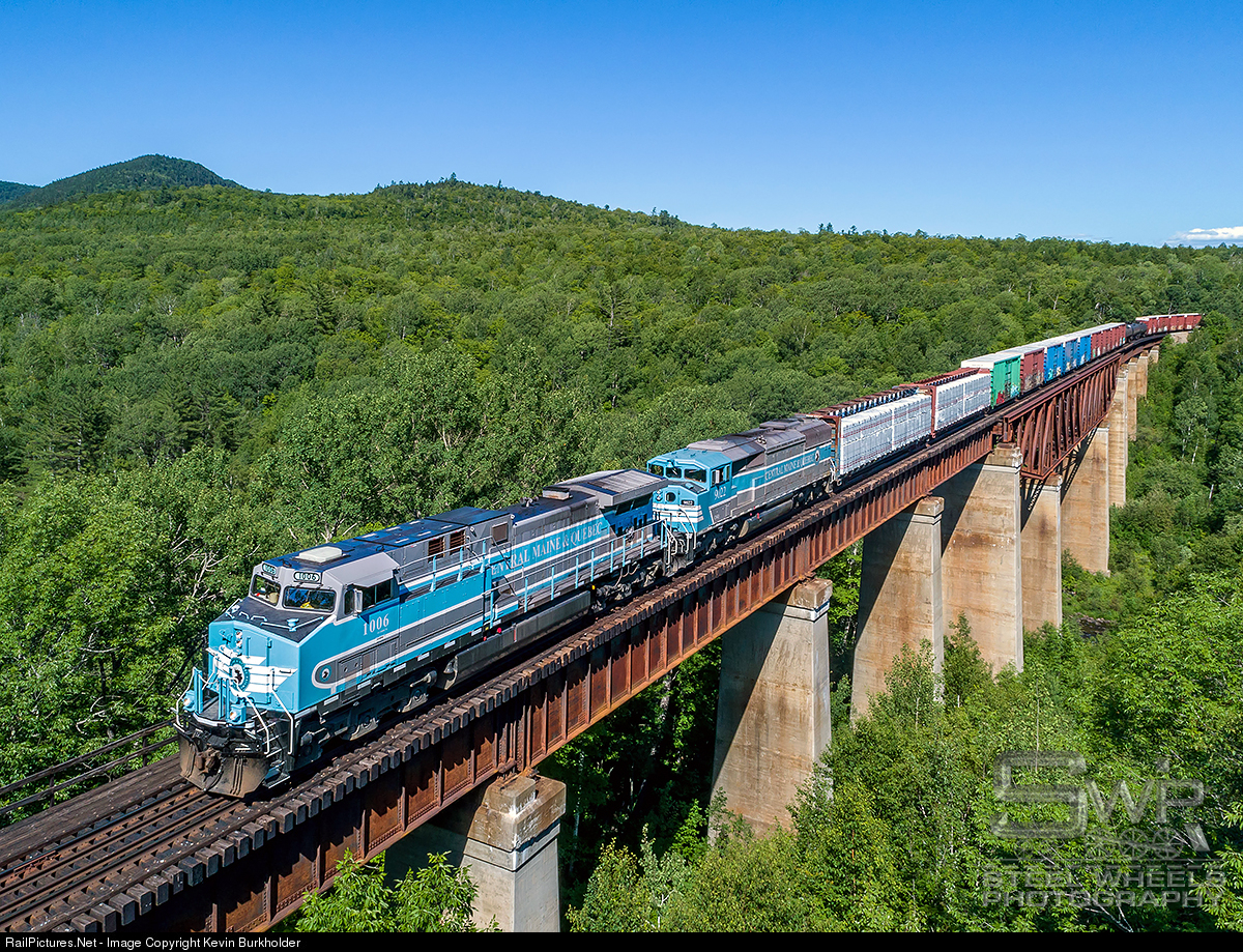 The July 11 Central Maine & Quebec train Job 1 is seen easing across the massive Onawa Trestle in the namesake town of Maine with CMQ AC4400CW 1006 and SD40-2F 9022 leading the hefty westbound.