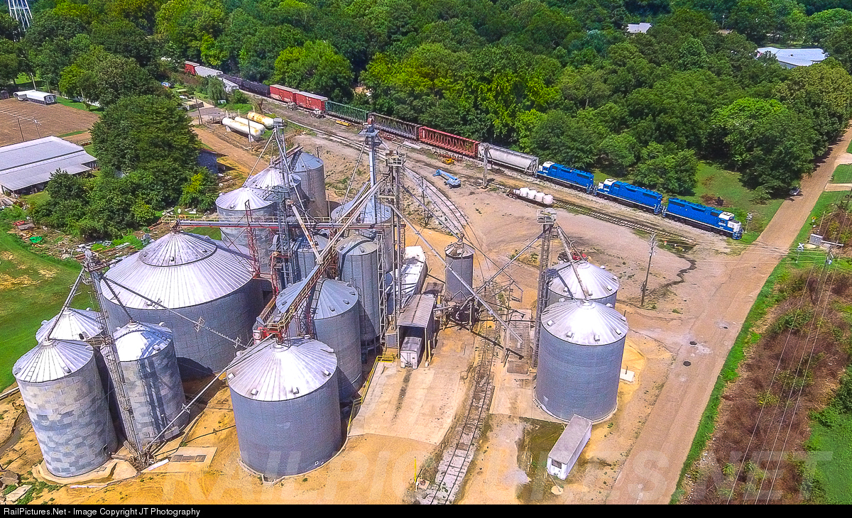 A southbound Grenada Railway train is seen behind the elevators of the North Mississippi Grain Co.