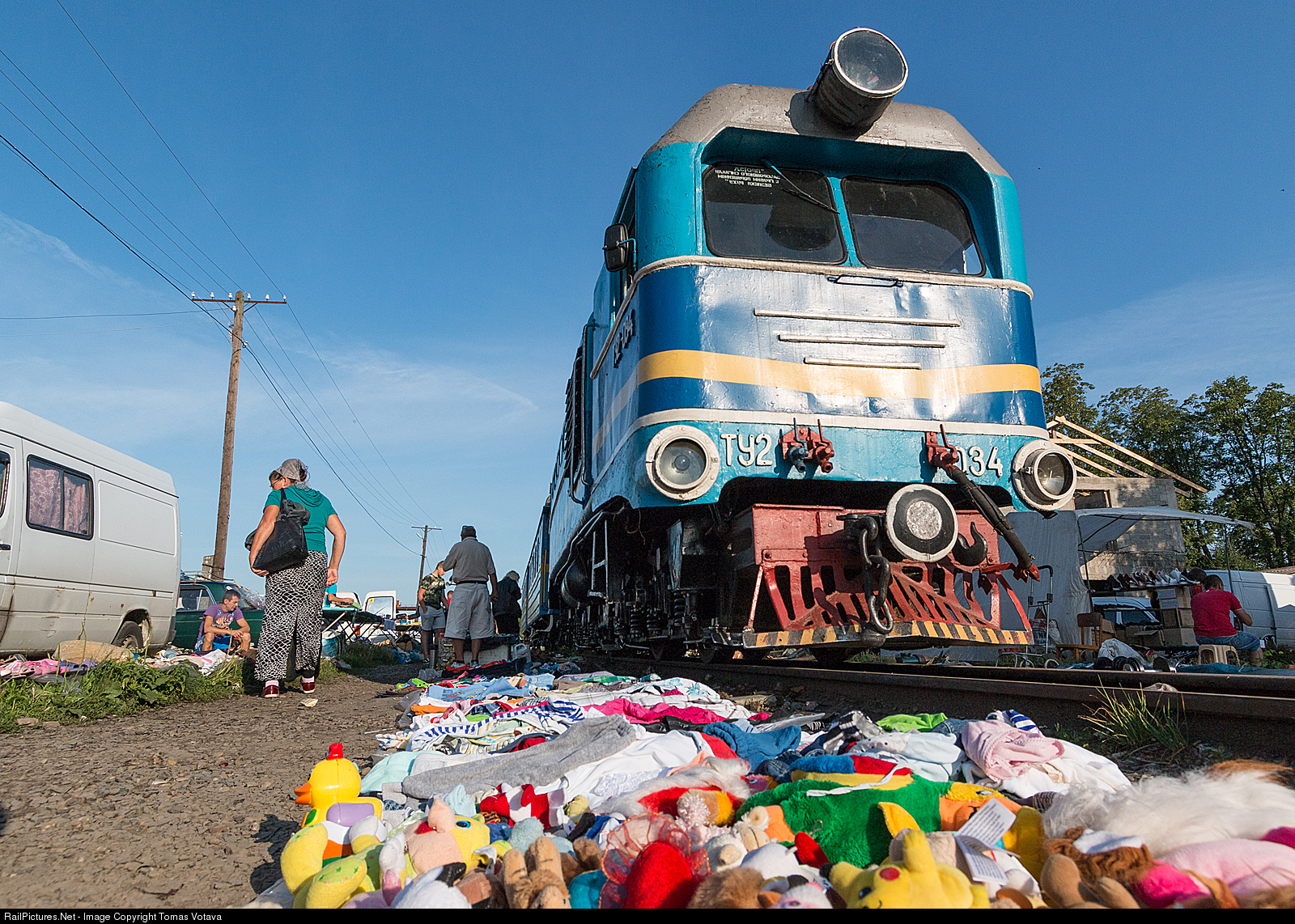 Last functional 750mm narrow gauge locomotive of Borzava Railroad (part of Ukrainian Railway, Lviv region) on sunday market in Vynohradiv. Market is directly on rails.