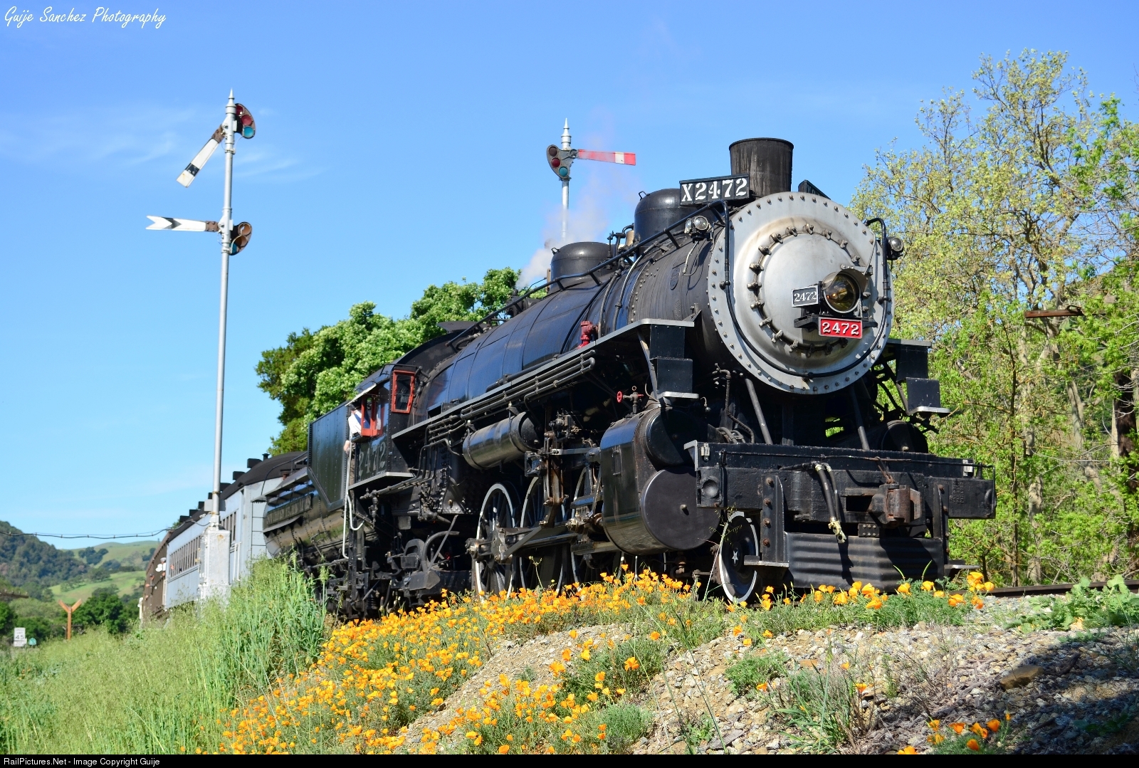 | SP 2472 gives a powerful shove through the semaphores, no longer in operation, for an excursion bound for Niles depot of the Niles Canyon Railway Museum during "Spring Steam Weekend 2015."