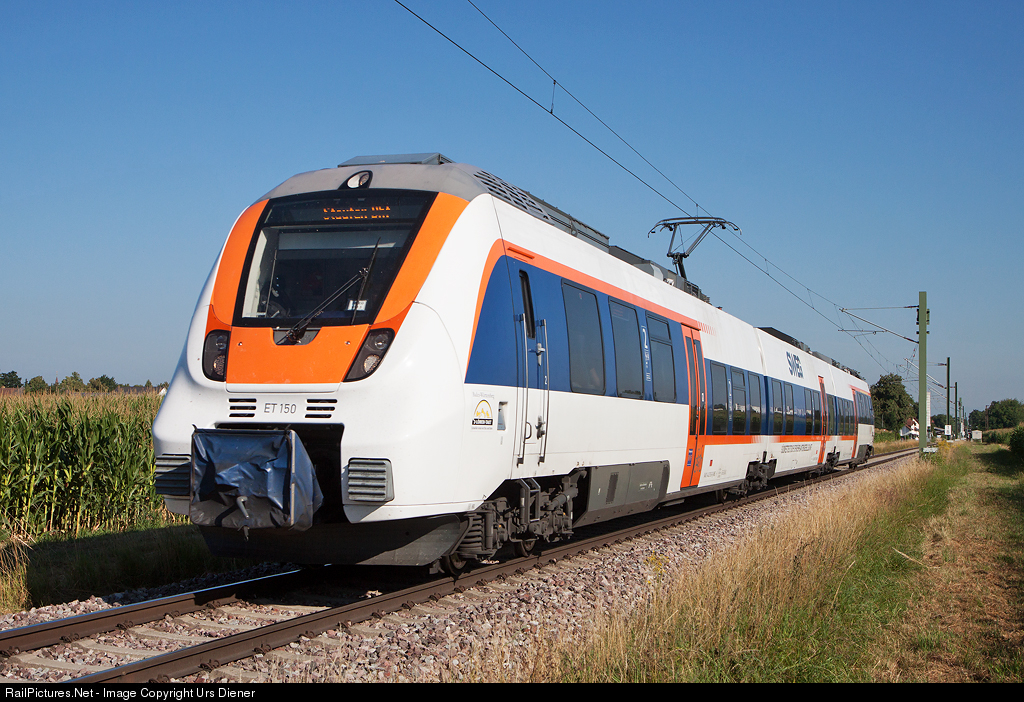 | Commuter trainset ET 150, built 2013 by Bombardier, on the way to Staufen im Breisgau. |