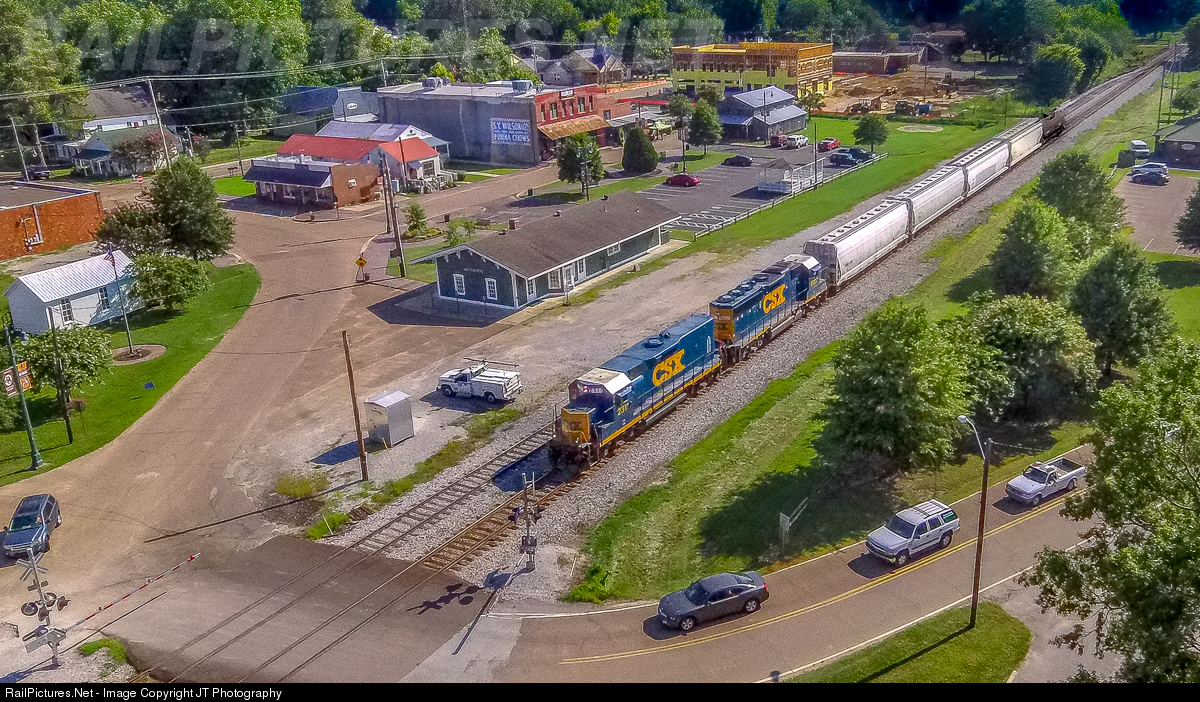 CSX 2311 rolls eastbound through the historic Arlington town square. The L&N depot can be seen to the left of the locomotives.